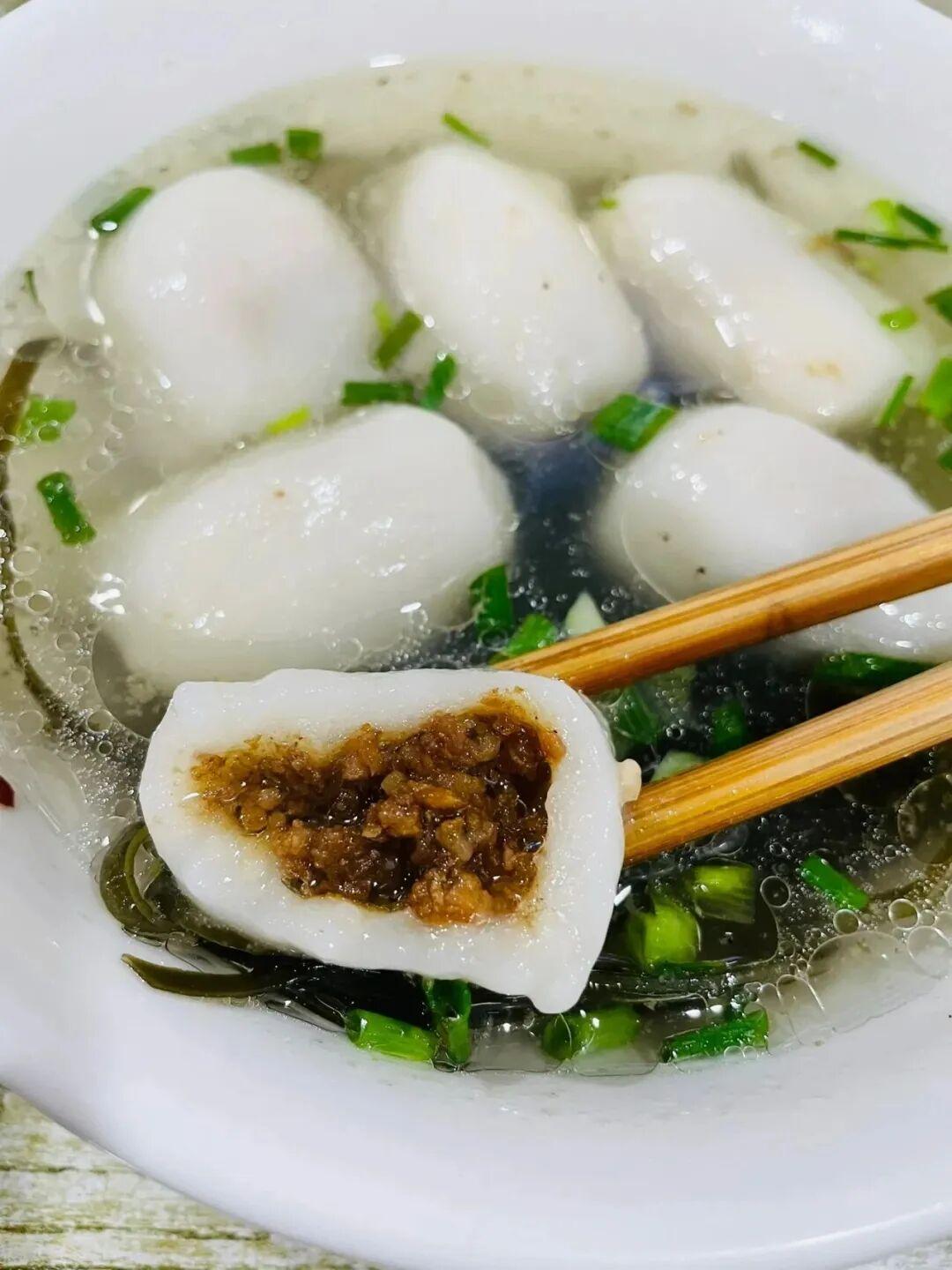 湯圓,稱之爲湯圓卻並非圓球狀,而是有點像雞蛋,圓的那頭是餡,與蛋黃的位置一致,尖的那頭則是糯糯的湯圓皮。