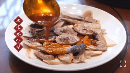 這是一道雞料理,將雞的頭部、頸部、胸部、腿部宰成八大塊,再連皮帶骨斜切成均勻的薄片,配以特製蘸料,辣、麻、鮮、香兼具。