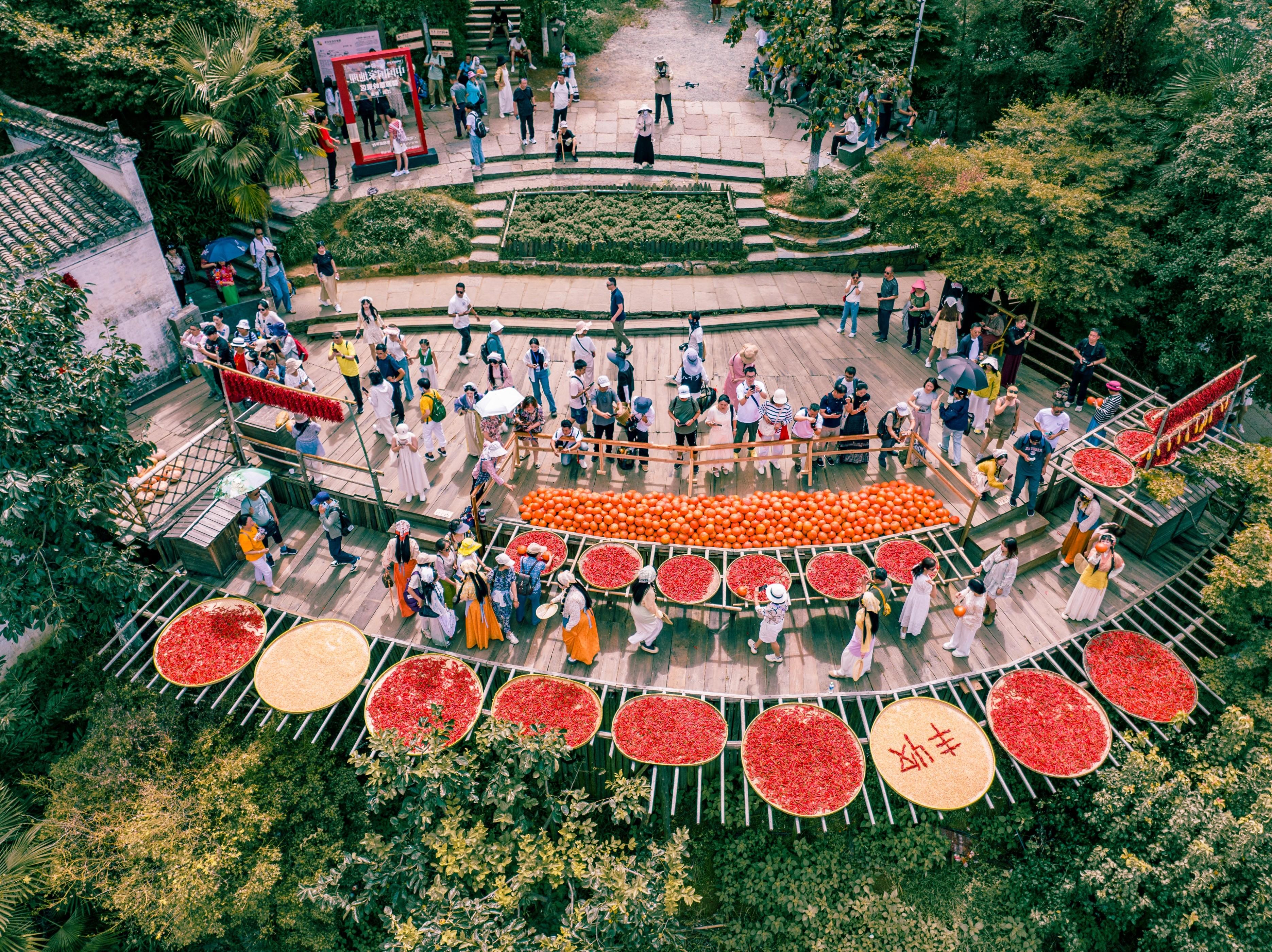 當陽光灑在江西省上饒市婺源縣篁嶺村層層疊疊的民居上,曬臺的竹匾裏,辣椒、玉米、南瓜片鋪展成了一幅斑斕的畫卷。街巷中,遊客們舉着相機,找着最佳拍攝角度;不遠處的天街集市裏,手藝人低着頭做着油紙傘,桐油的清香隨風飄散……