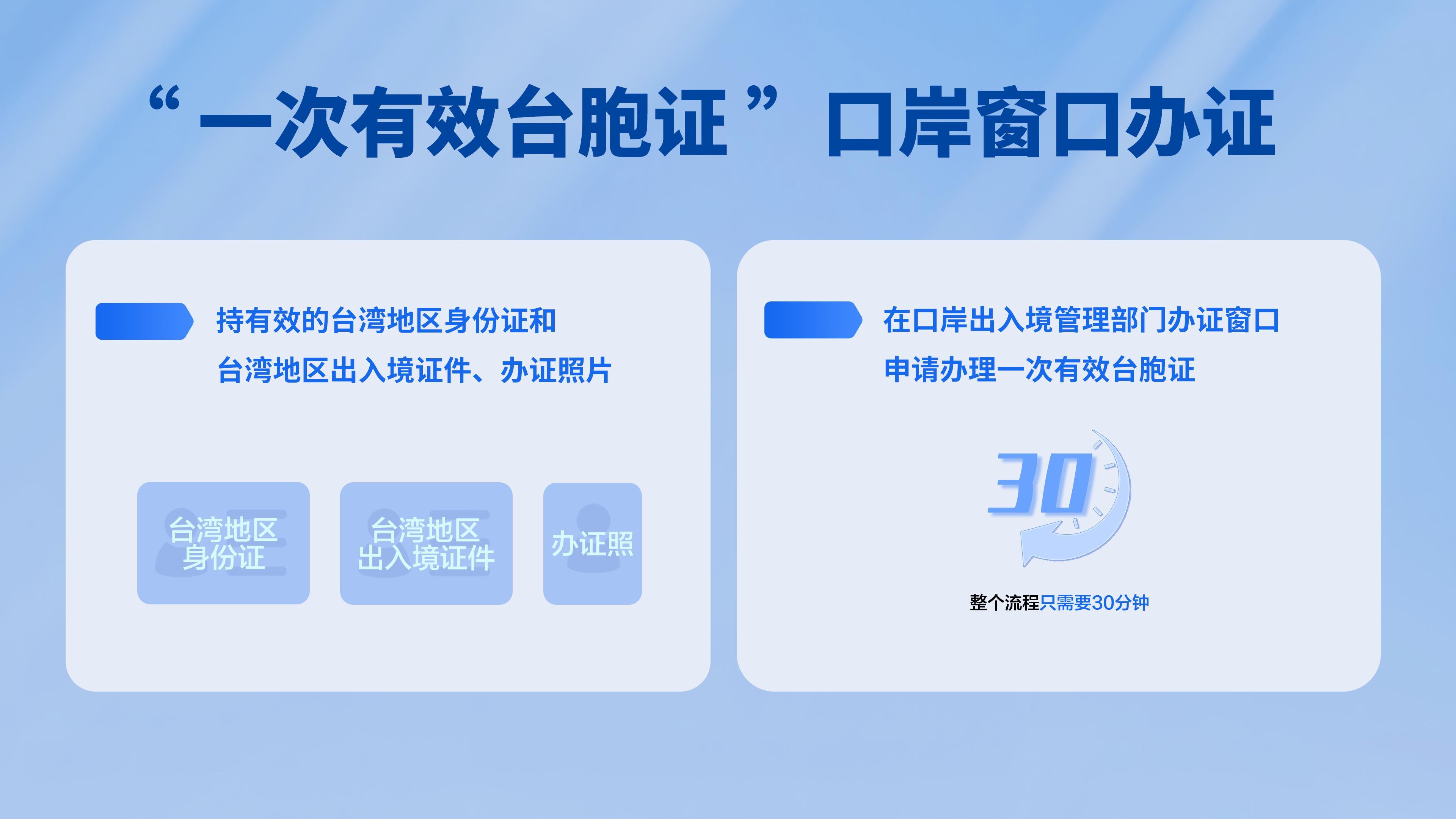 如果臺胞朋友們沒有提前辦理5年有效臺胞證,在抵達上述口岸後,持有效的臺灣地區身份證和臺灣地區出入境證件、辦證照片,可以在口岸出入境管理部門辦證窗口申請辦理一次有效臺胞證,整個流程只需要30分鐘。擬搭乘“小三通”航線從福建口岸入境的臺胞,可以在口岸窗口申請辦理一次有效臺胞證,也可以在網上申請辦理,即登錄“移民局12367”應用軟件或微信、支付寶“移民局12367”小程序,在“一次有效臺胞證申請”欄中填寫《臺灣居民來往大陸通行證申請表》,並按規定上傳申請材料,經批准後,抵達入境口岸時可領取證件。臺胞來大陸無論是辦證還是入出境,都不會在證件上做任何標記。大陸有關部門依照有關法律法規要求,嚴格、有力、有效保護臺胞的個人信息安全。