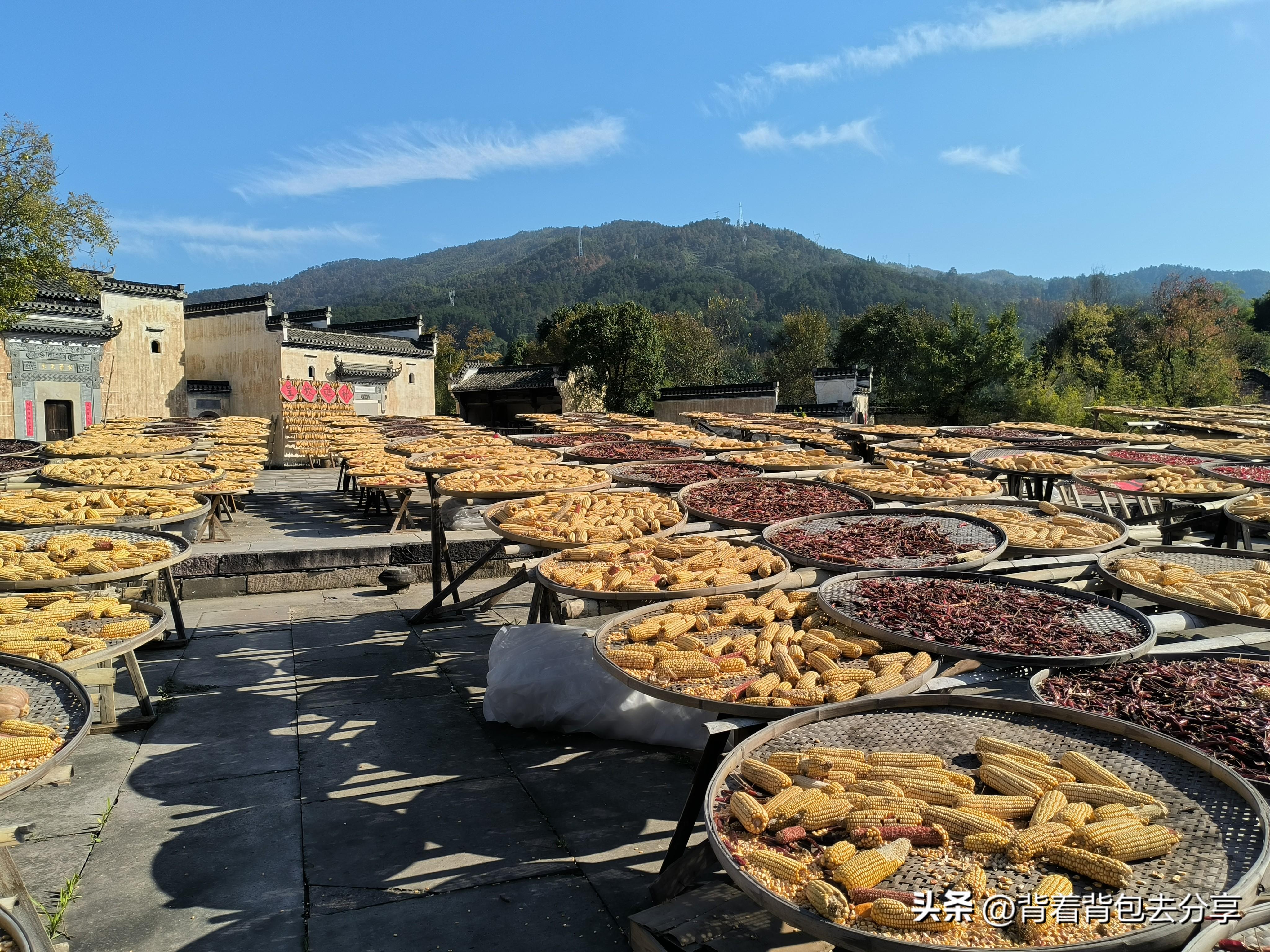 曬秋廣場,曬秋是皖南的特色,當地特色的習俗,廣場上將豐收的作物一筐筐的攤曬,有辣椒.玉米.豆子等,紅火的顏色顯得格外的熱鬧,這裏感受到秋天的浪漫,還可以藉助豐收的作物,打卡拍照也非常出片