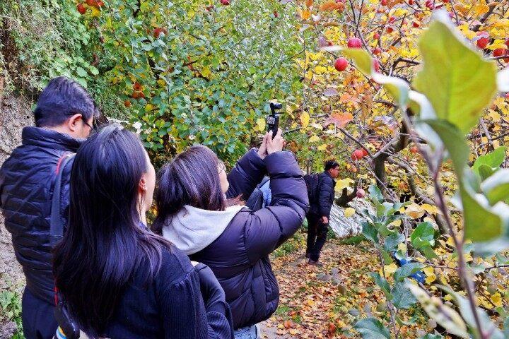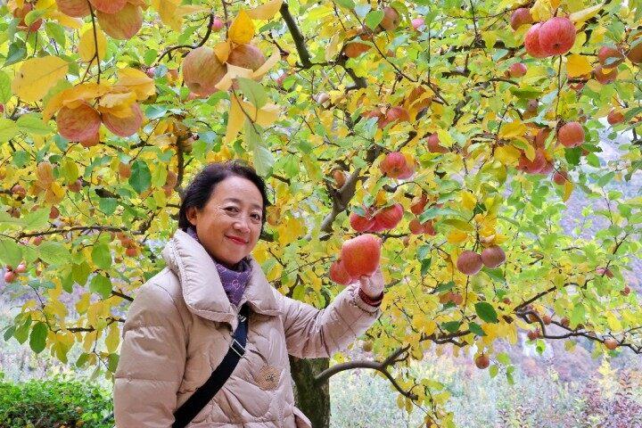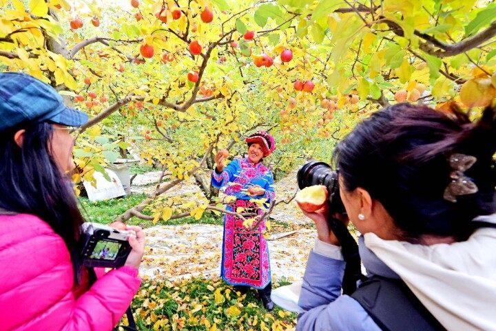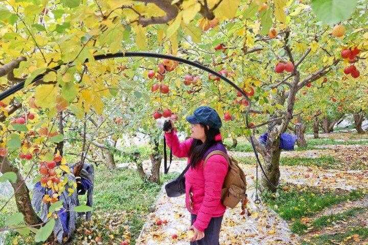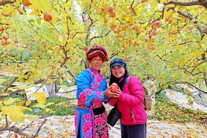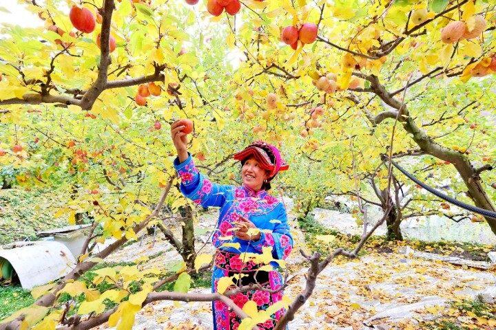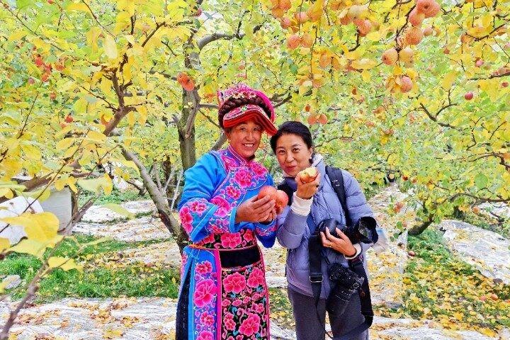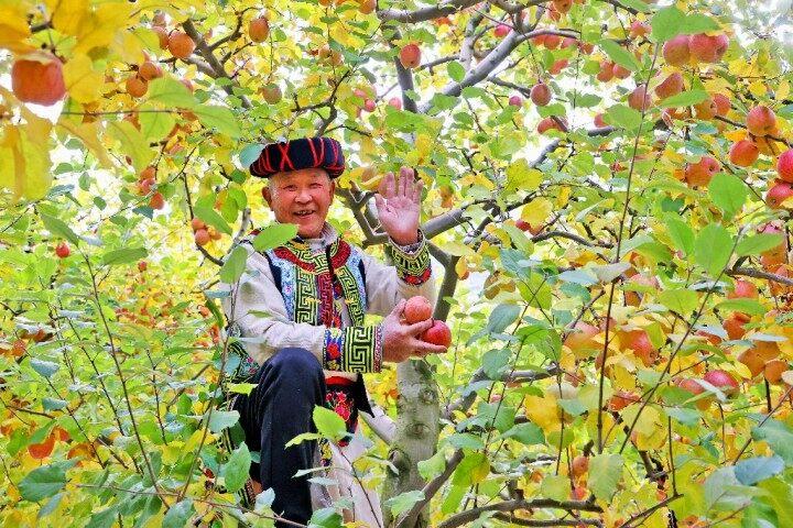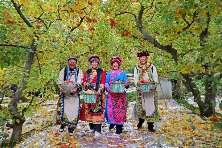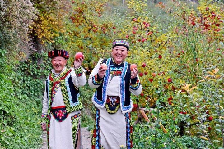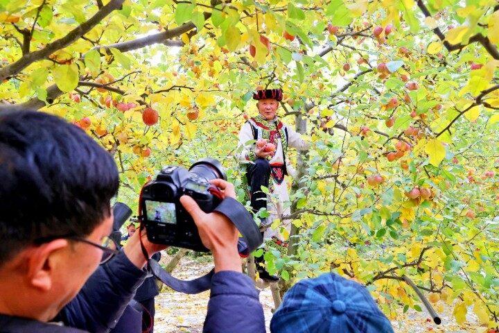 穿着民族服裝採摘蘋果的當地羌族村民成爲一道亮麗風景 記者 陳晨 攝