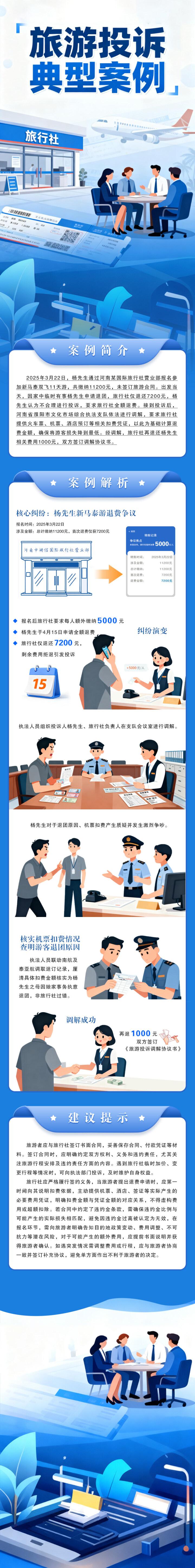 2025年3月22日,楊先生通過河南某國際旅行社營業部報名參加新馬泰雙飛11天遊,共繳納11200元,未簽訂旅遊合同。出發當天,因家中臨時有事楊先生申請退團,旅行社僅退還7200元,楊先生認爲不合理進行投訴,要求旅行社全額退費。接到投訴後,河南省濮陽市文化市場綜合行政執法支隊依法進行調解,要求旅行社提供火車票、機票、酒店預訂等相關扣費憑證,以此爲基礎計算退費金額,確保將遊客損失降到最低。經調解,旅行社再退還楊先生相關費用1000元,雙方簽訂調解協議書。