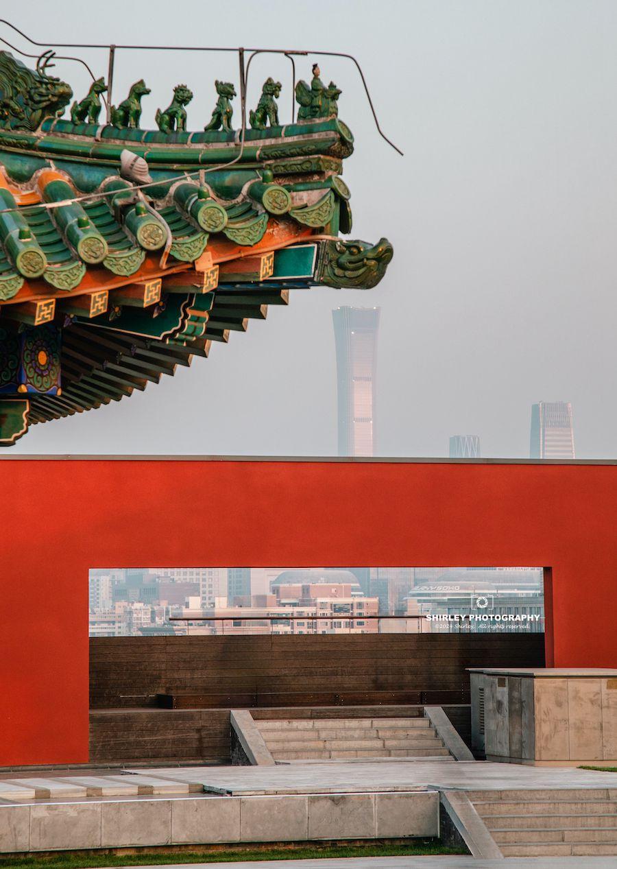 觀景臺由4座紅牆金瓦的仿古建築和庭院組成,如同空中小故宮,也呼應了隆福寺的歷史軸線。兩側紅牆各開一扇觀景長窗,豐富的城市天際線盡收眼底,古都新城就這樣交織在視線裏。從北海白塔、景山萬春亭、中國美術館、中央電視塔、中國尊再到東四胡同羣…一座天台既囊括了城市的古今脈絡,彙集了地標建築,又展現了市井煙火。