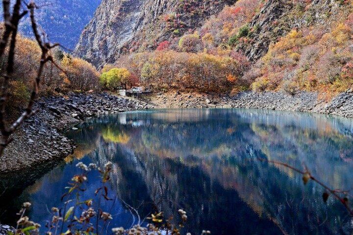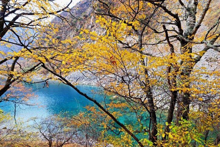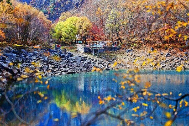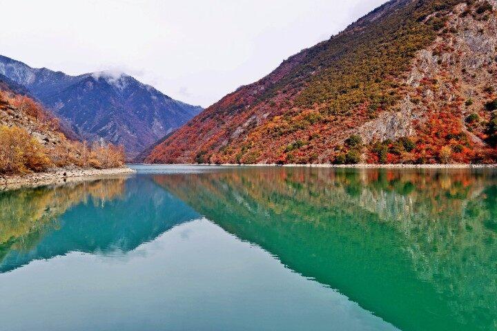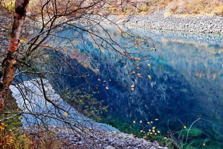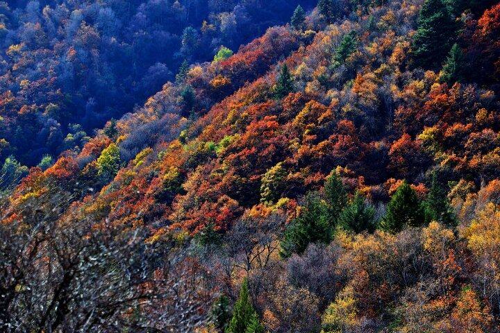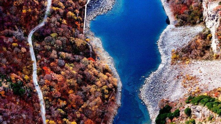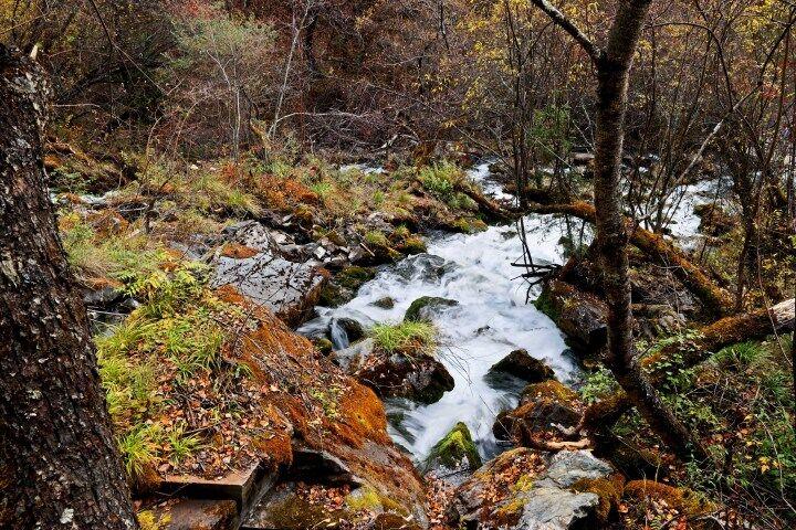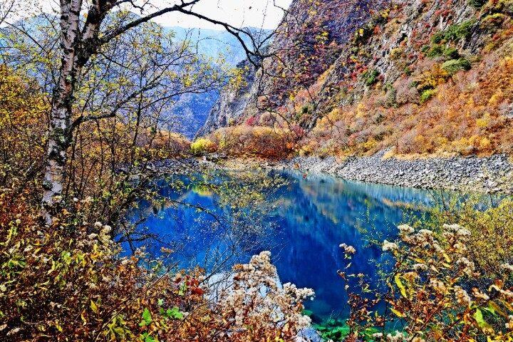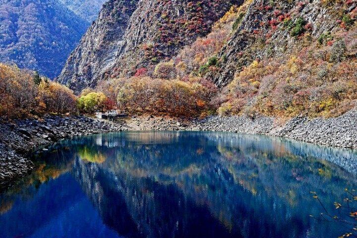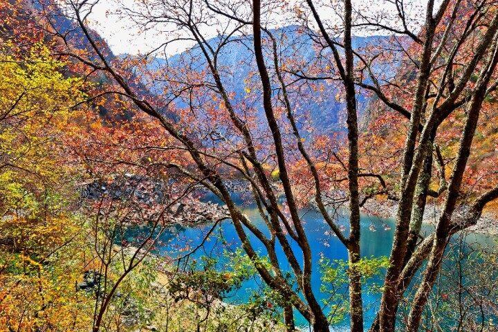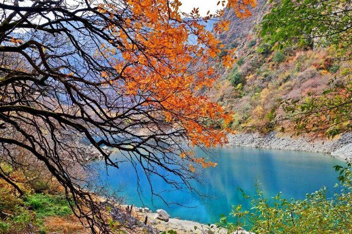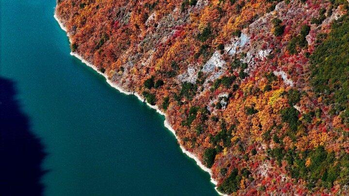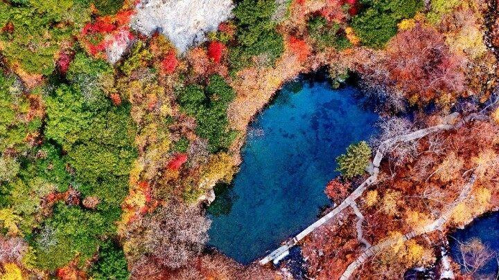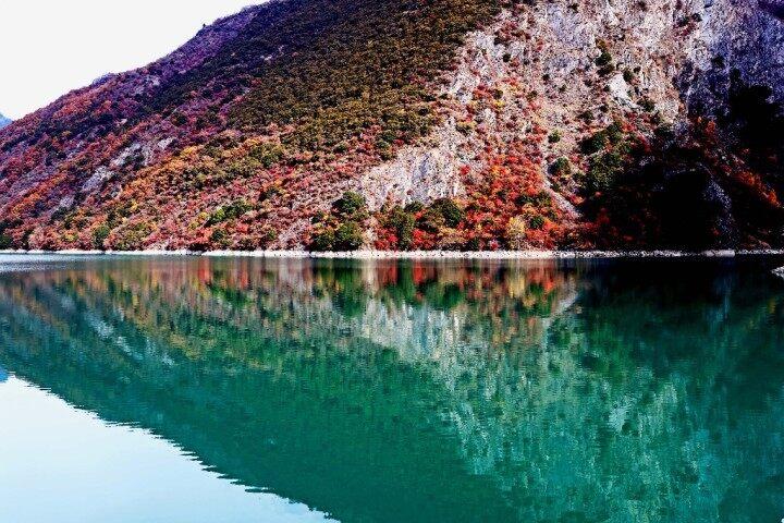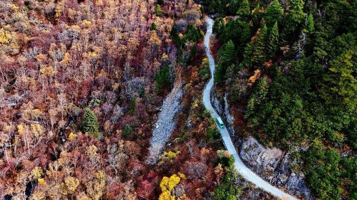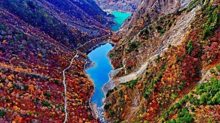 初冬時節,四川阿壩藏族羌族自治州茂縣疊溪鎮松坪溝景區風光旖旎、絢爛多姿。景區內的彩葉林色彩豐富,紅、黃、綠、灰、橙,五顏六色的樹木與山間流淌的溪流、遠處高聳的山峯,以及散落於山間或湛藍、或碧綠的大小海子,共同構成了一幅渾然天成、無比靈動的自然山水畫卷。