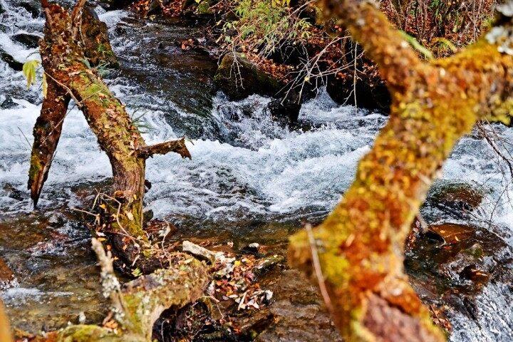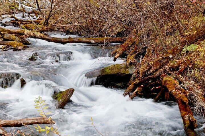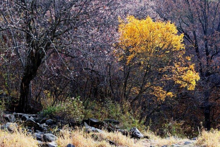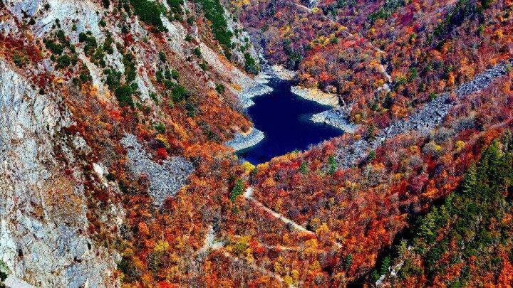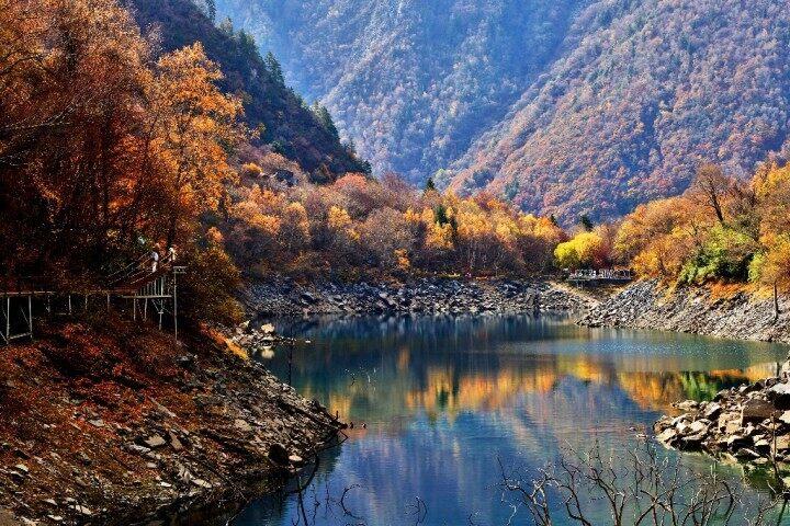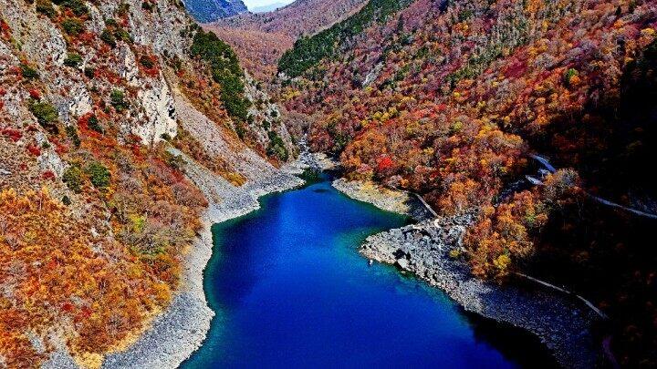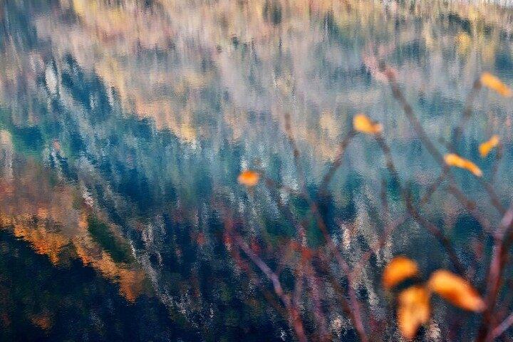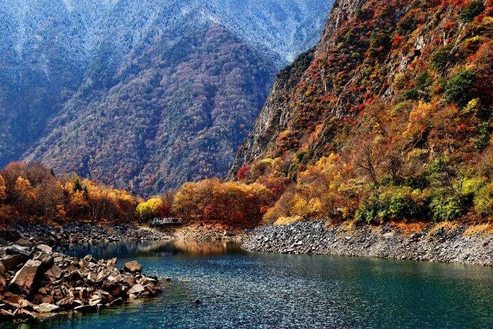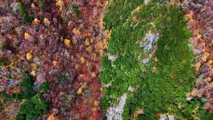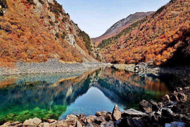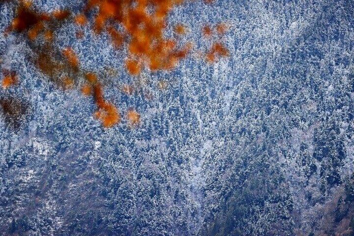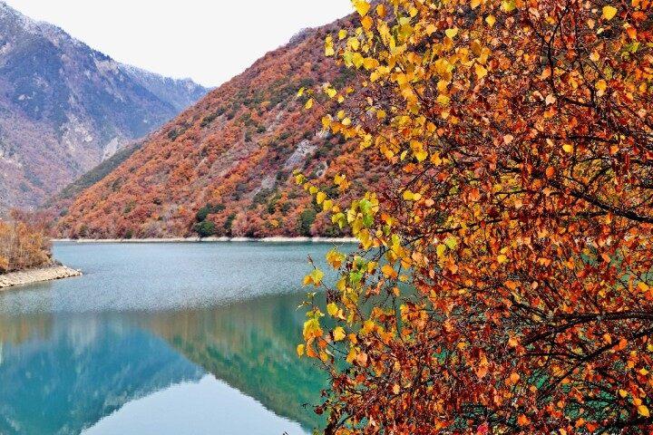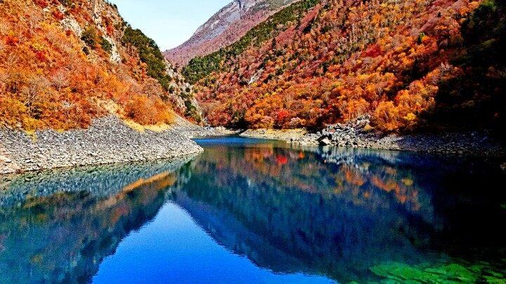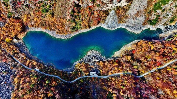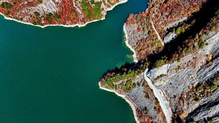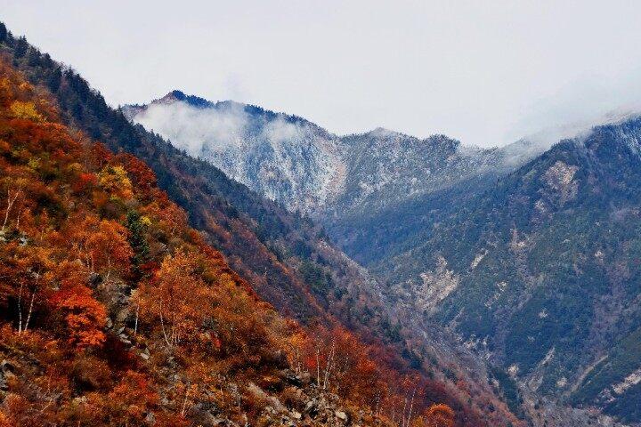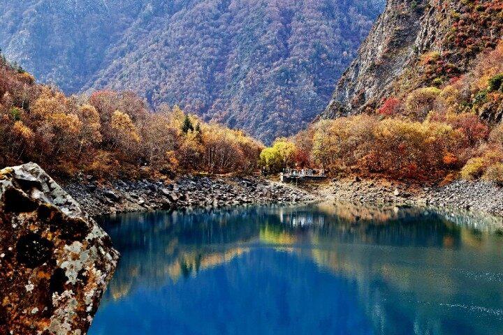 初冬時節,四川阿壩藏族羌族自治州茂縣疊溪鎮松坪溝景區風光旖旎、絢爛多姿。景區內的彩葉林色彩豐富,紅、黃、綠、灰、橙,五顏六色的樹木與山間流淌的溪流、遠處高聳的山峯,以及散落於山間或湛藍、或碧綠的大小海子,共同構成了一幅渾然天成、無比靈動的自然山水畫卷。