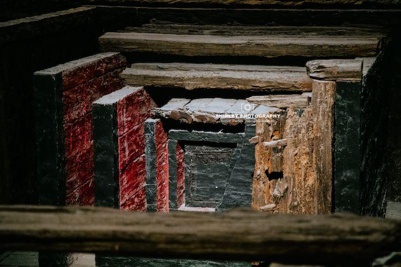 大葆臺的黃腸題湊,全部使用有香味、耐腐蝕的去皮黃心柏木共計15880根(黃腸),取木材中段裁成長90cm、截面10cm的長方體木條,端頭向內側排列(題湊)。這些木頭壘疊成總長42米、高3米的木圍牆,如森嚴的禁衛垂首而立,將棺槨圍繞其中。上方的巨大星空藻井象徵“天人合一”,瞬間帶人回到2000年前的神祕時空。