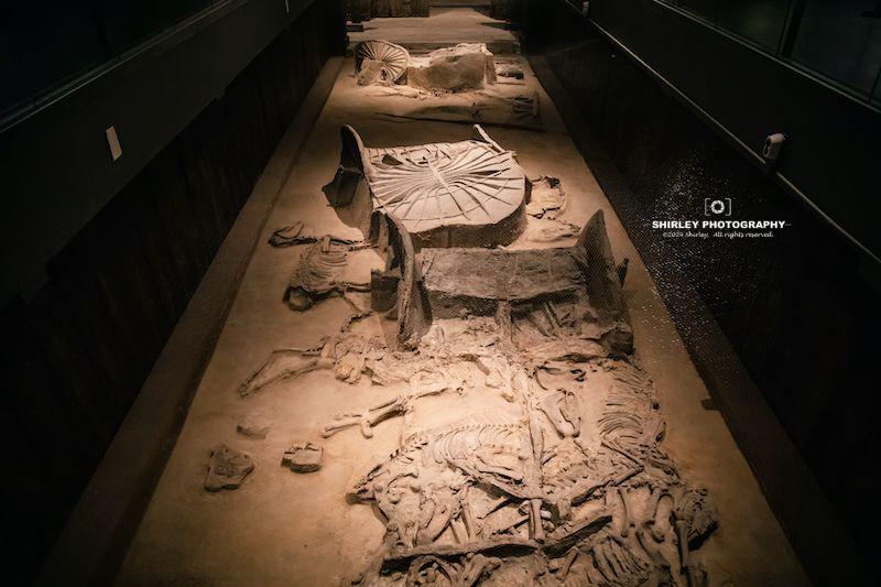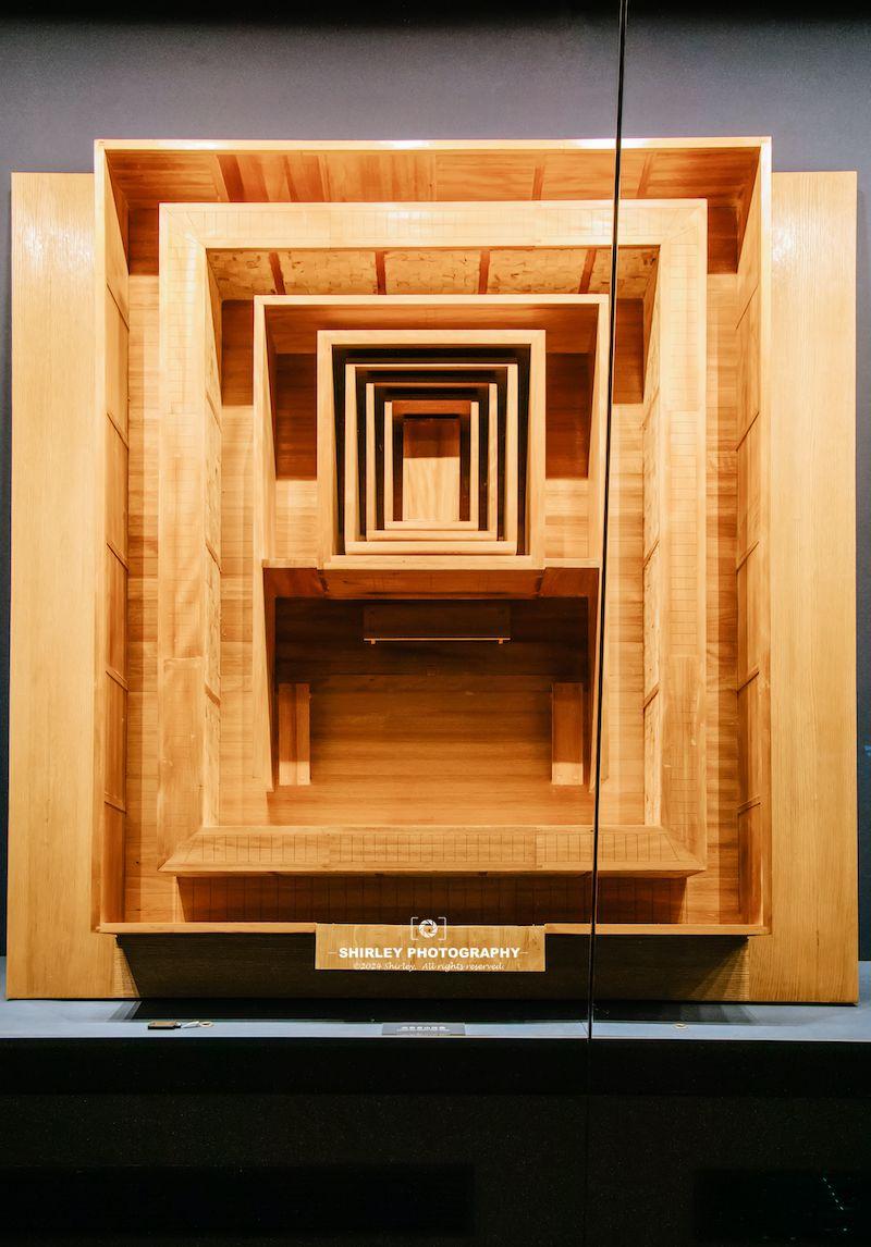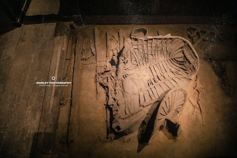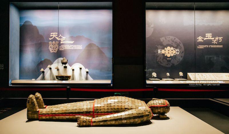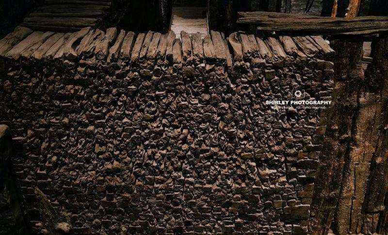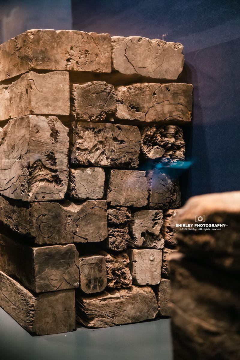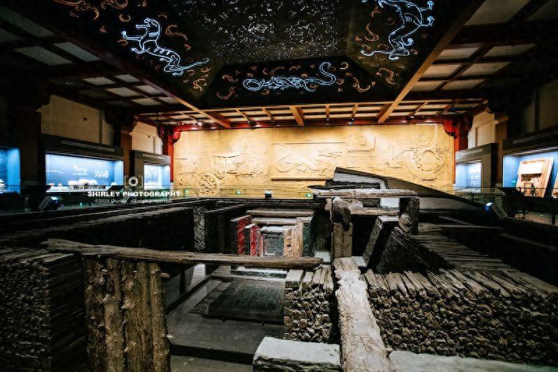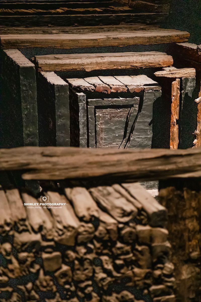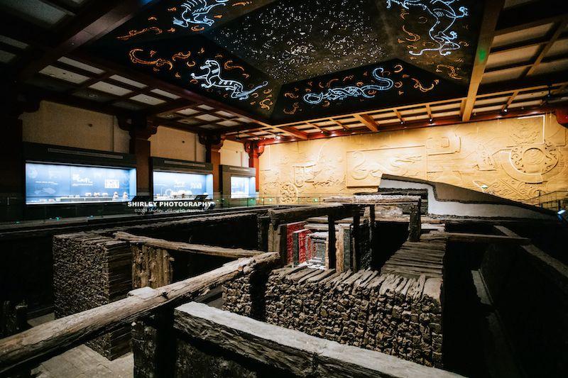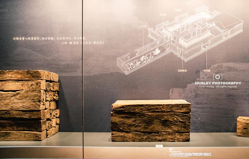 博物館最大的看點莫過於位於基本陳列展廳壓軸處的墓室,頂部的封土已經基本被刨去,只留下北部一小塊展示木炭、白膏、封土疊加的土層結構。核心內容黃腸題湊,直到兩千年後的今天,仍散發着似有若無的柏木味道。
