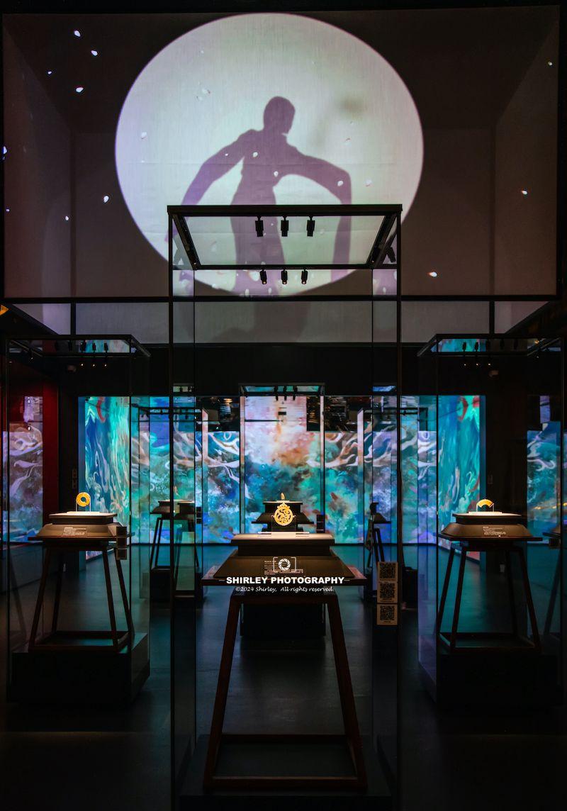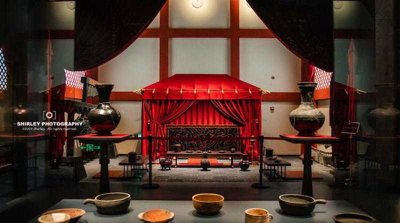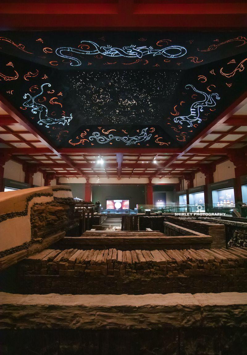 大廳頂部有漢代非常飄逸風格的古畫,現場還有還原漢代風格的王室宴會廳,復刻古人跪坐在矮几前飲酒喫飯、樂人在兩邊彈奏編鐘和磬的生動畫面。