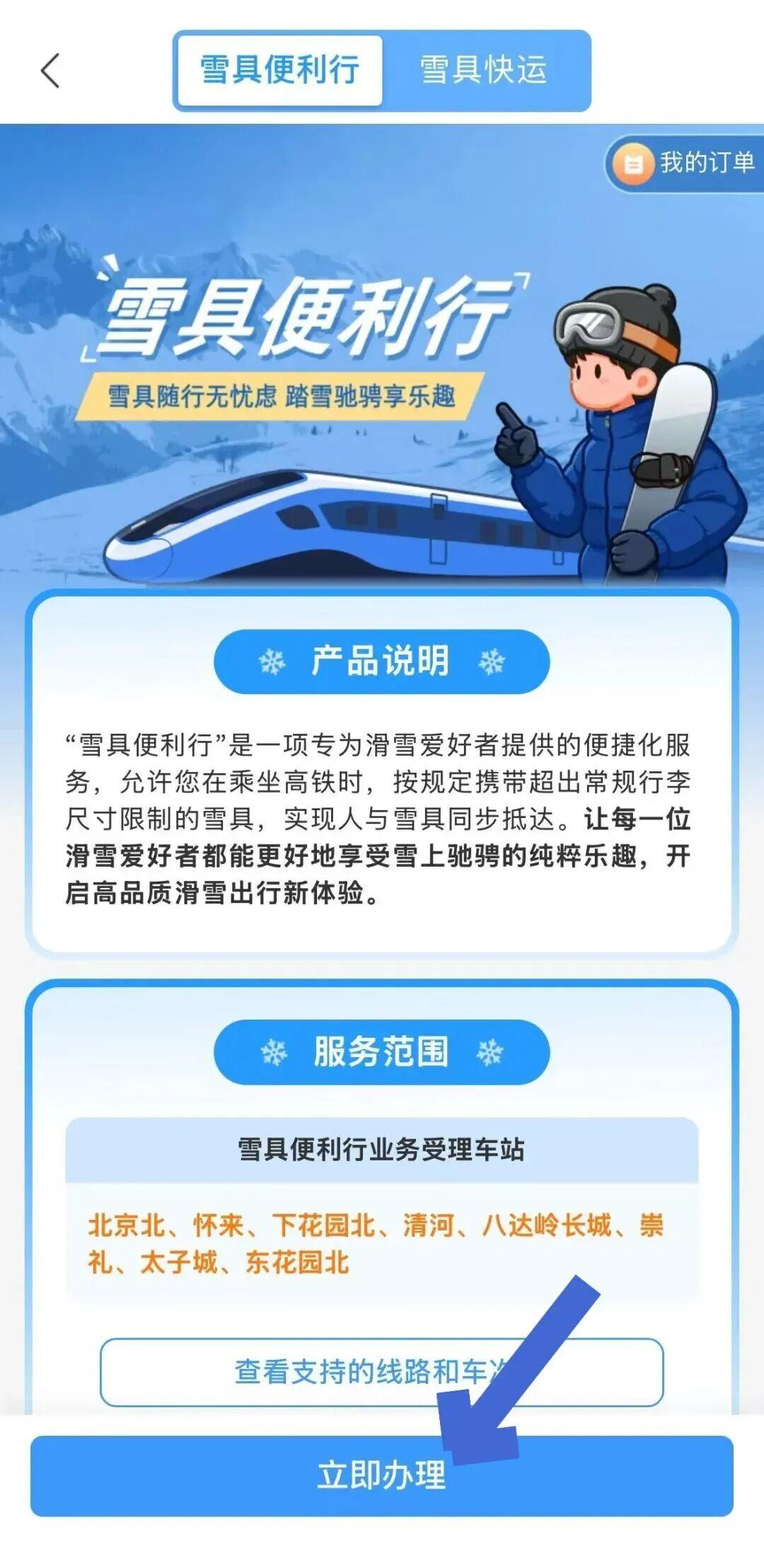 旅客選擇該服務後可攜帶長、寬、高之和不超過200釐米的雪具同車出行,滑雪更加方便快捷。對於長、寬、高之和超過200釐米的雪具,由於高鐵列車車內空間限制,仍需辦理託運。