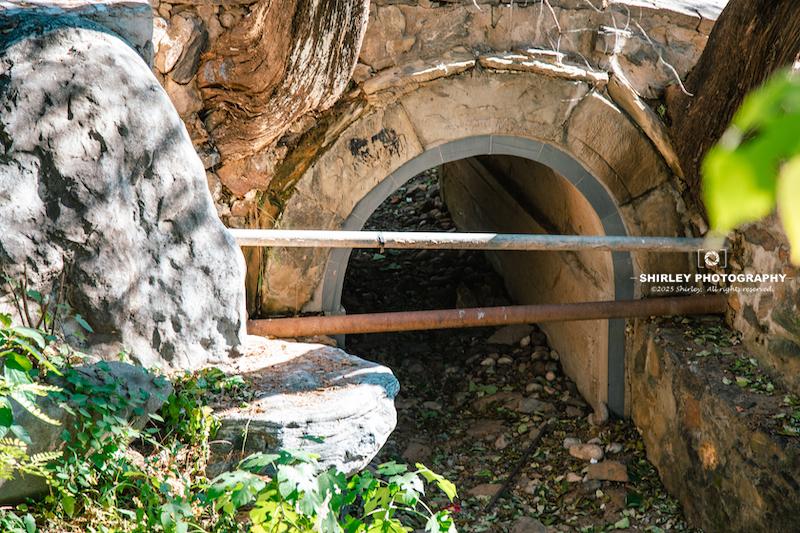 位於山門前的必經之路上,因爲體量太小,十分容易錯過。這座孔石拱橋是明代原物,其奇特之處在於橋體石板接縫的天然石隙中,頑強地生長出四棵古側柏,樹齡皆超過五百歲,形成“橋在樹上,樹抱橋中”的共生奇觀。