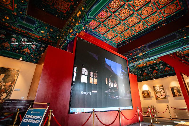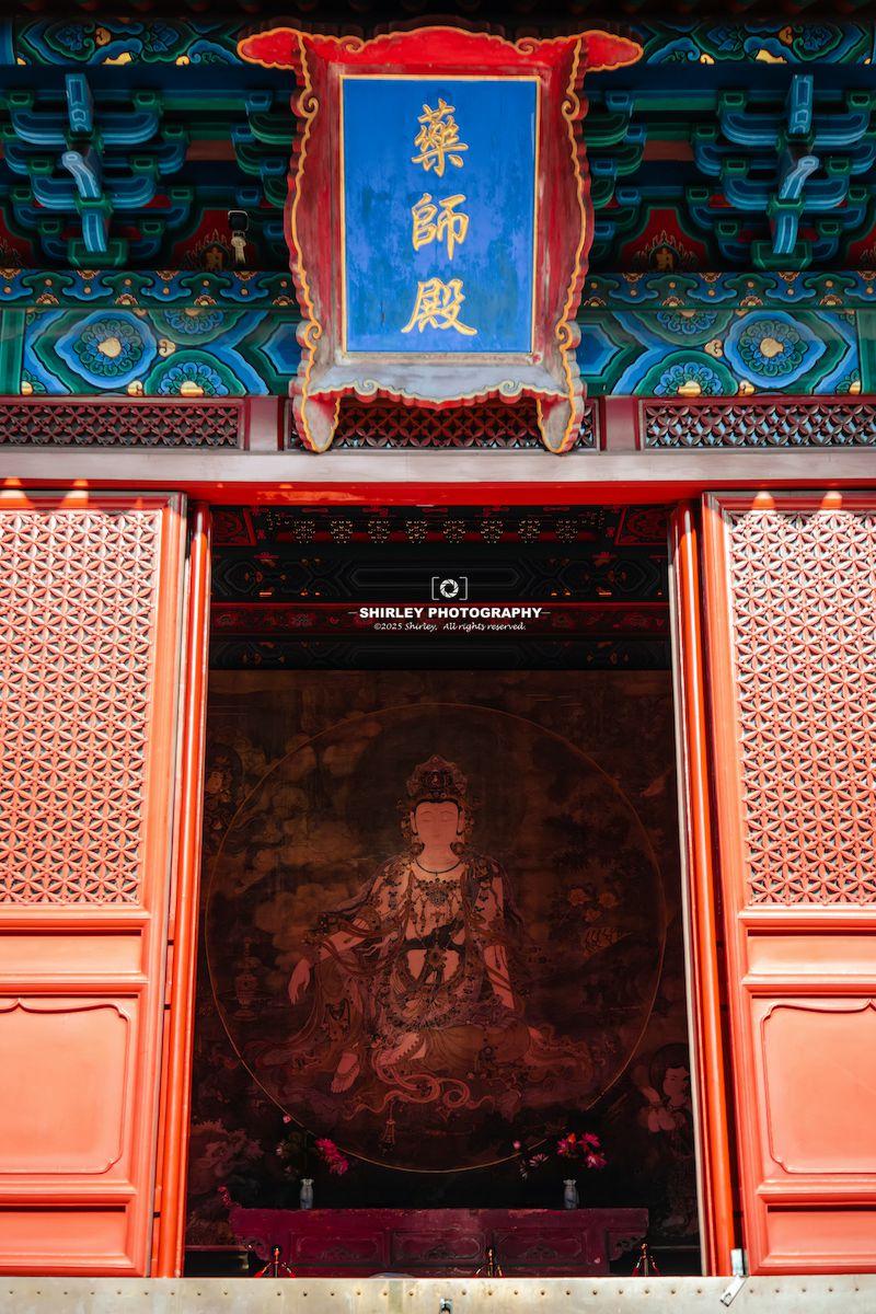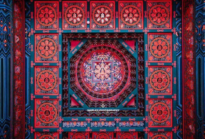 另外,藥師殿裏除了復刻壁畫,連大雄寶殿頂部的曼陀羅藻井也一併復刻了。藻井採用最隆重的“鬥八”形制,中央圓井內以瀝粉貼金工藝繪製密宗曼荼羅圖案,金碧輝煌,深邃莊嚴,體現了明代皇家寺院的至高規格與精湛工藝。