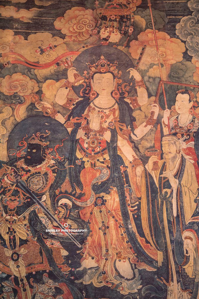 壁畫共10鋪,其中《水月觀音圖》《帝釋梵天禮佛護法圖》最爲經典;尤其是《水月觀音圖》,被譽爲觀世音菩薩壁畫之最。壁畫都是由當時的宮廷畫師們繪製,主要運用了瀝粉堆金和疊暈烘染兩大技巧,大量金粉堆砌使得每一條輪廓線都產生了浮雕般的“裸眼3D”效果。顏料使用上的考究及奢華賦予壁畫獨有的皇家美感,這是敦煌壁畫或永樂宮壁畫所不具備的。