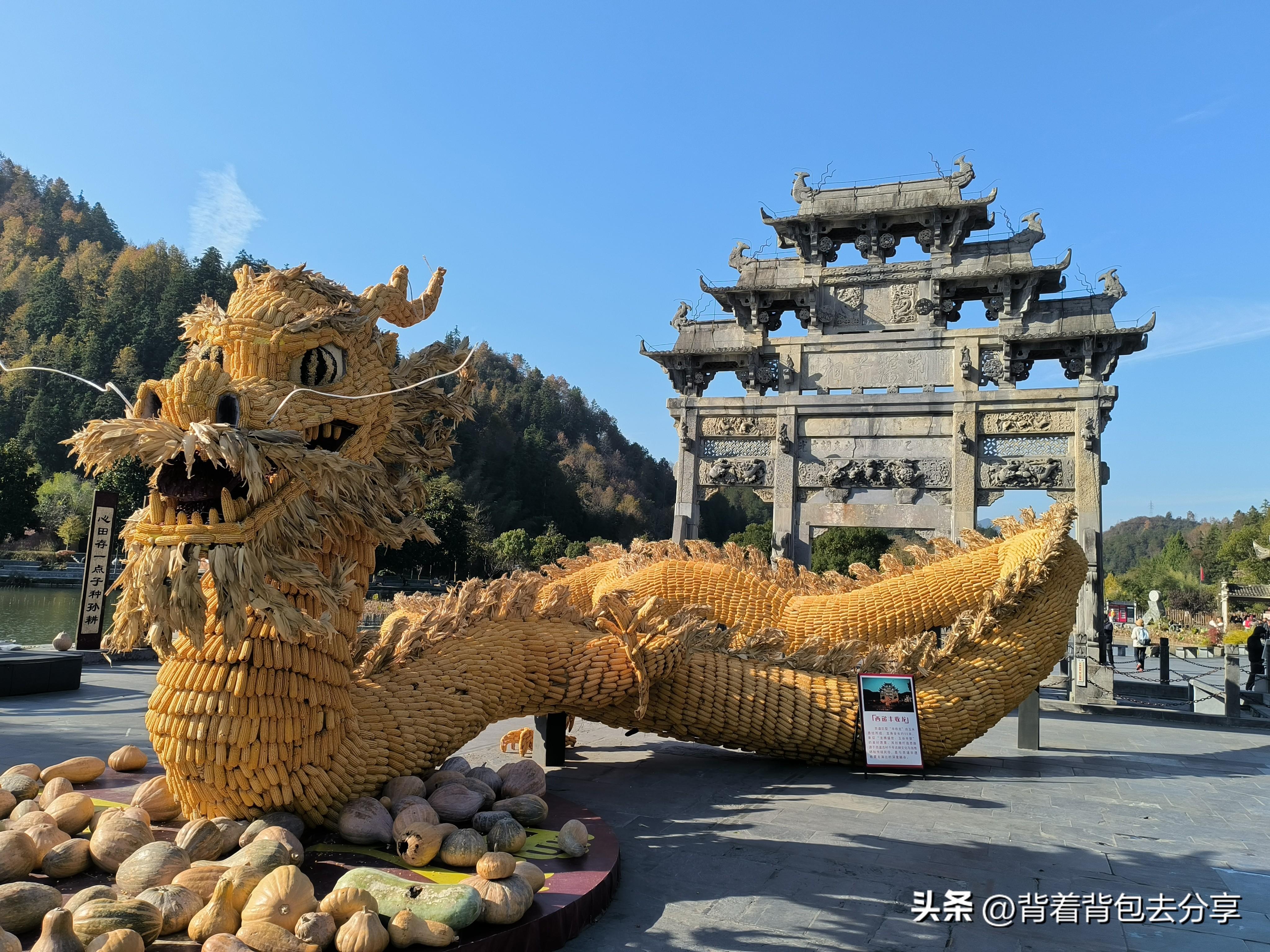 按照四年之前路線遊玩,先是來到了西遞村古建築羣,記得,四年之前,與兒子在此拍照打卡,那時還給兒子講起,西遞與宏村兩座村落,也正式從這裏進入西遞,在古村外有座牌坊,名爲胡文光刺史坊,與四年之前有所不同,現在牌坊前,用玉米做成龍的造型,非常逼真,很多遊客紛紛在此拍照打卡,來到這裏,曾經與兒子講起,在西遞曾經在西遞有很多的牌坊,現僅存一座,這座牌坊也是西遞的門照牌樓