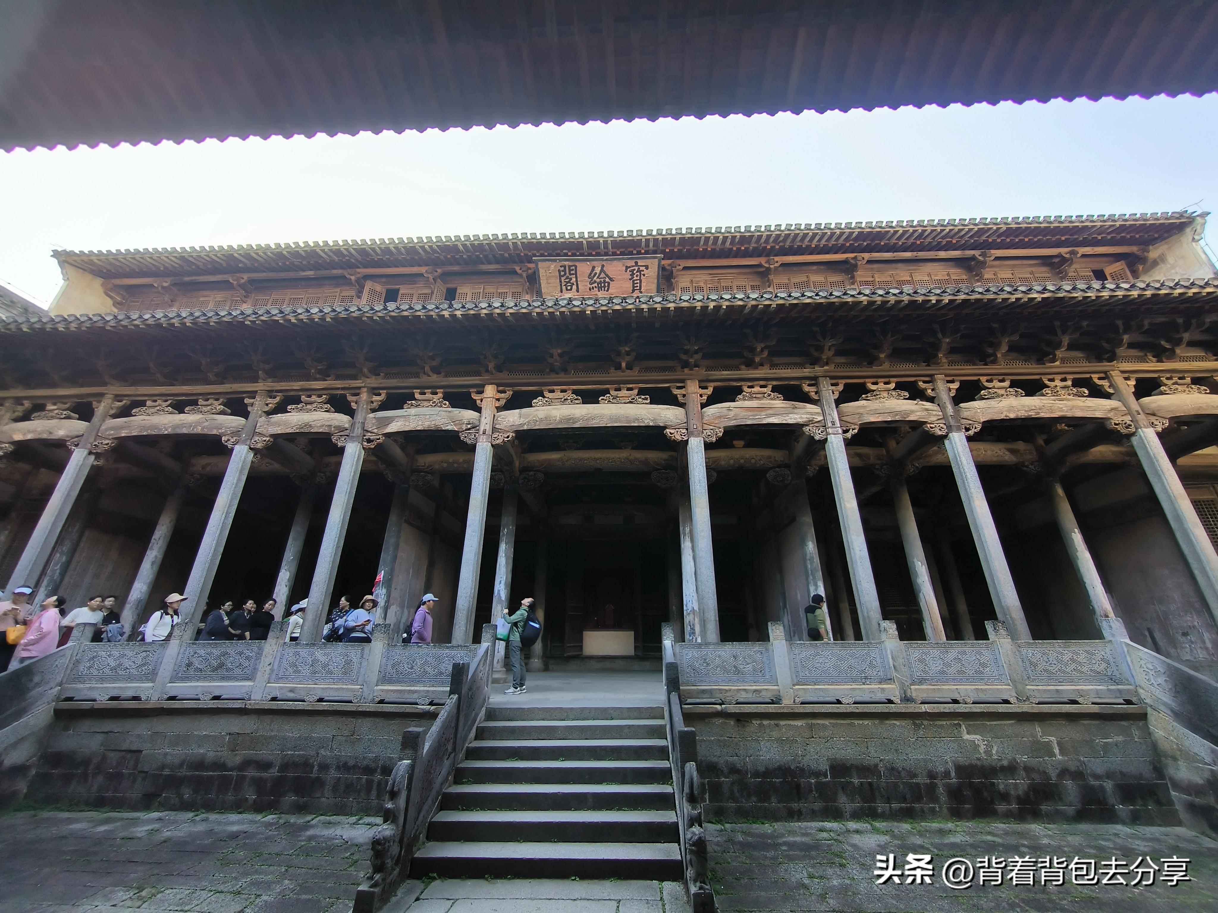 從下屋出來之後,便來到了呈坎建築最精華的寶輪閣,全稱爲貞靖羅東舒先生祠,因21年維護,今天專程參觀,這所祠堂是呈坎羅氏族人,爲供奉其先祖羅東舒先生而建造,這個祠堂規模尤爲宏大,而且營造精細,有說法是前三進,仿照山東孔廟風格建造,最後一進,則是頗有故宮太和殿的樣式,而被譽爲江南第一名祠的羅東舒祠,是徽州古建築的典範之作,在安徽省博物院內,有寶輪閣的微縮模型,能細節的看出每處建築的精華