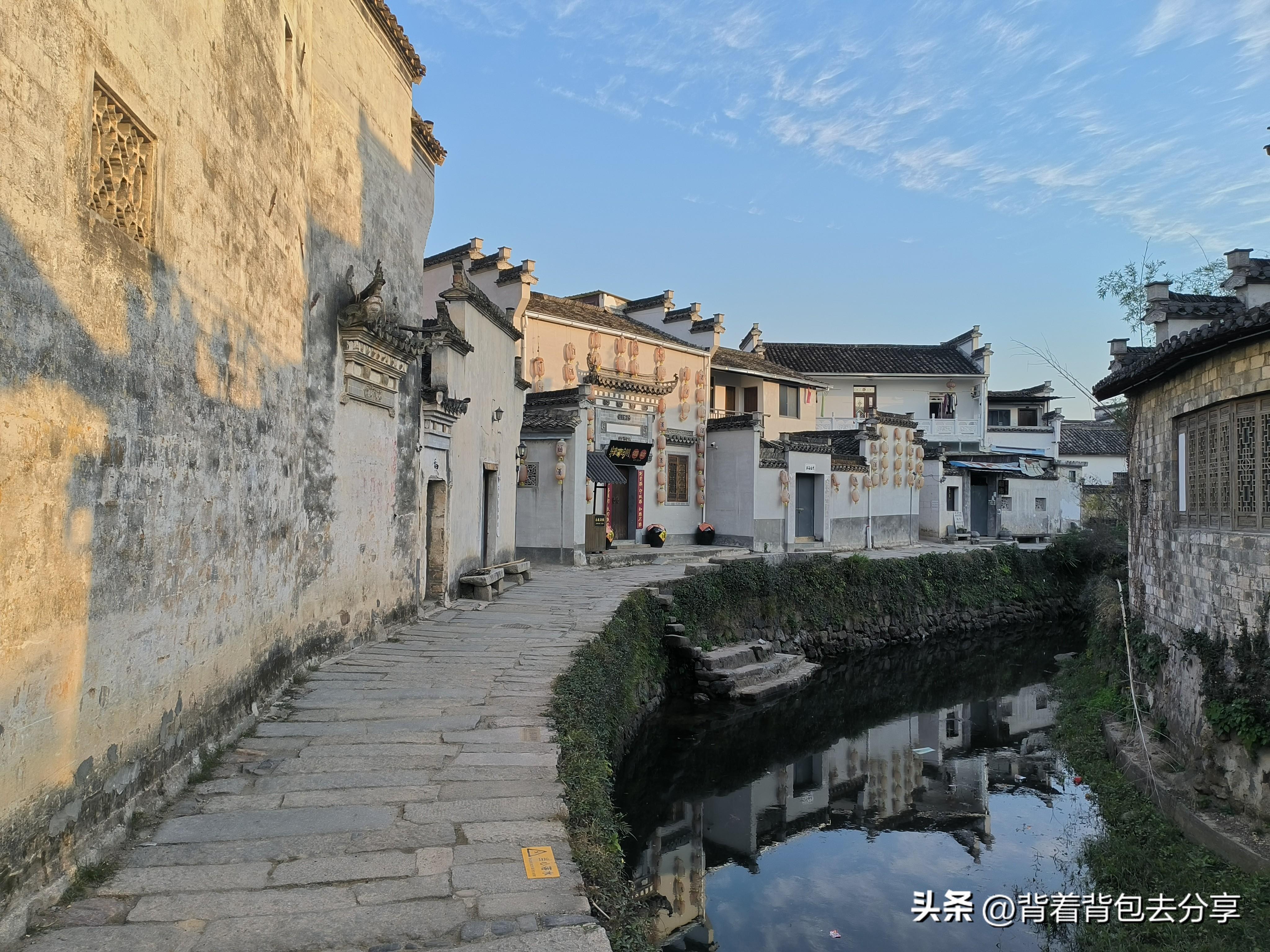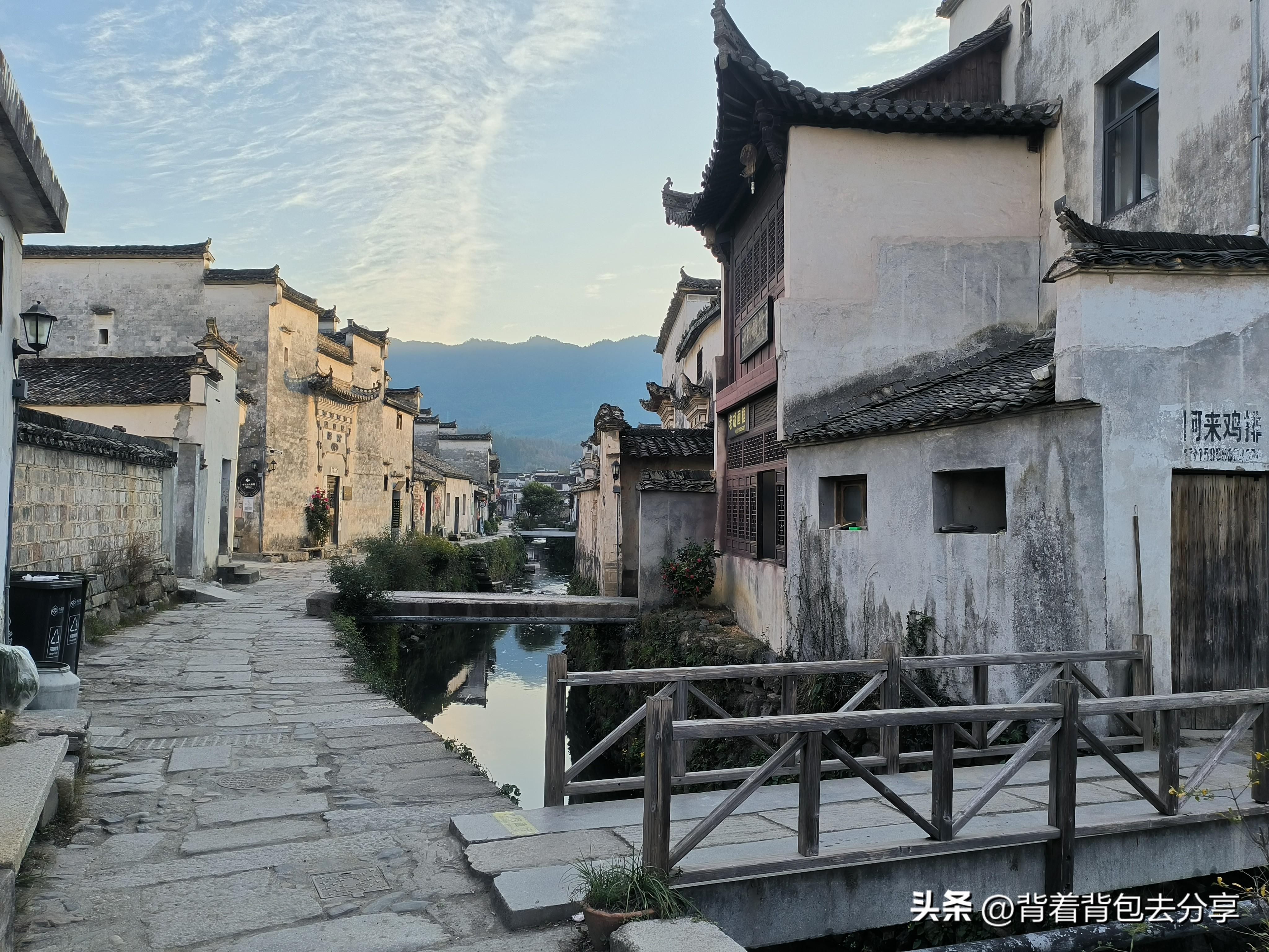 雖然沒有工作人員,但我依然堅持掃碼,隨後截圖保存至手機內,方便進入古村內驗票,從遊客中心到下橋亭還有一段距離,橋上有牌匾古橋物色,也就是正式進入古村,我從左手邊開始遊覽,緊接着來到了屏山拱峙,遠看馬頭牆,旁邊是小橋流水的景象,從這裏拍照非常出片,過了屏山拱峙便是御前侍衛,在這裏正好碰見浙江的那位女遊客,在此反覆拍照,我找取角度拍攝,遇見古村工作人員,得知現在的御前侍衛,已經改爲酒店與餐飲