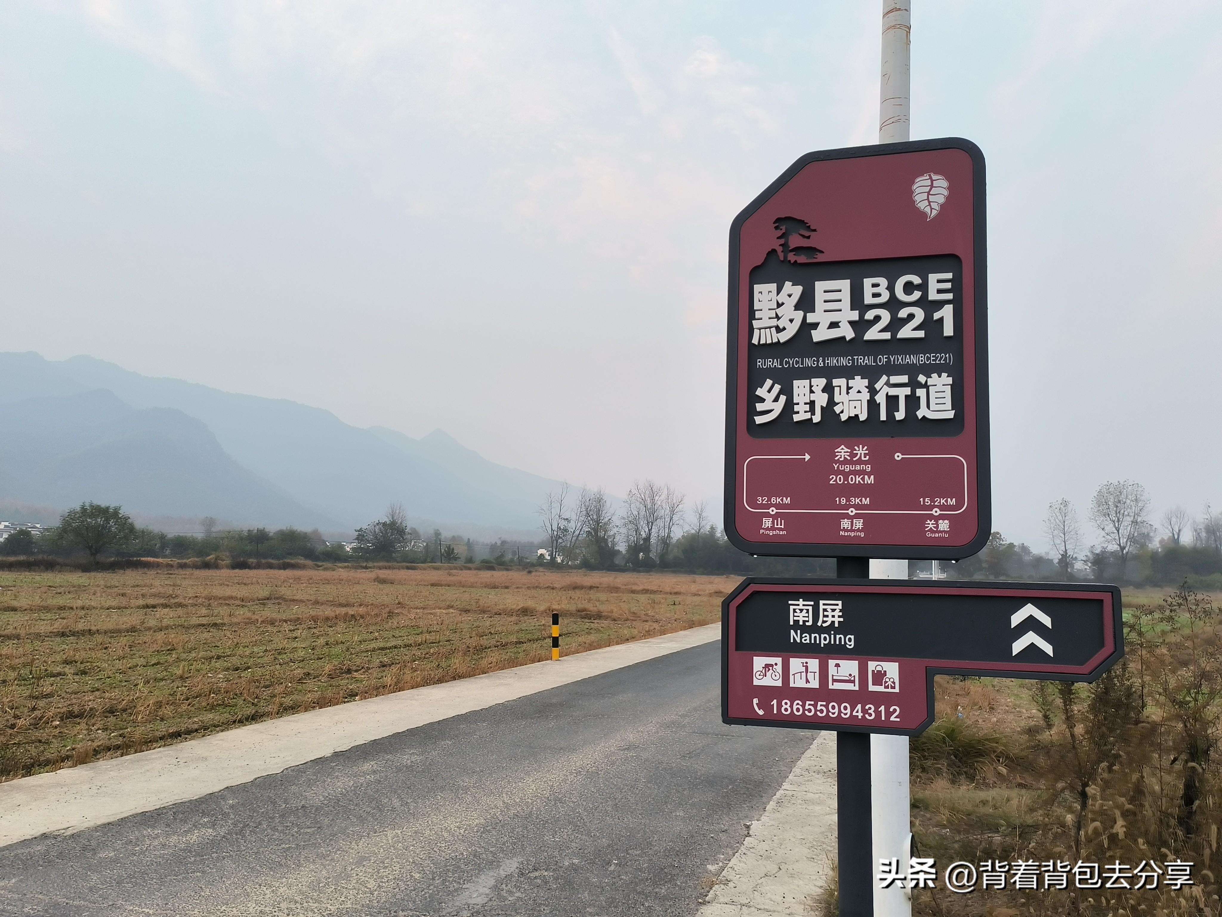 當我走到宏村大道時,才知已離開縣城,這邊也沒有店鋪,很好別說早點鋪面了,索性從揹包裏拿出昨天所剩的燒餅,一邊喫着燒餅,繼續向前趕路,在一處十字路口,看到一處人文景觀,西漢廣德國都景區,從這裏步行去往屏山古村,還剩近2公里左右,環着鄉村道路,看着遠處的山巒,不知不覺已到達屏山古村遊客中心,景區還未營業,後來查看了一下上班是八點,不過,在停車場處,看到有人過來,當時還以爲是工作人員,後來搭訕便知,這位浙江遊客也是來遊玩的