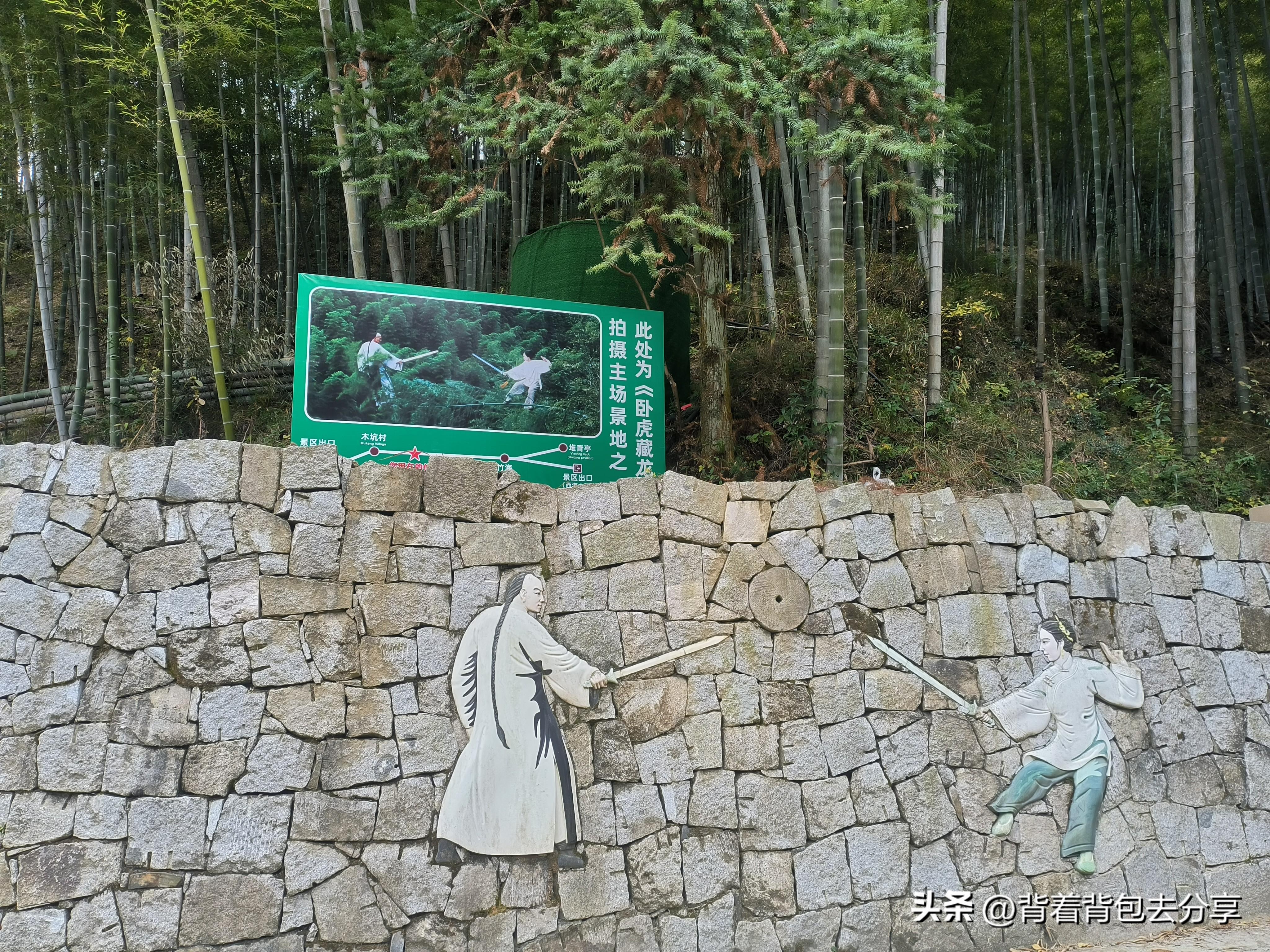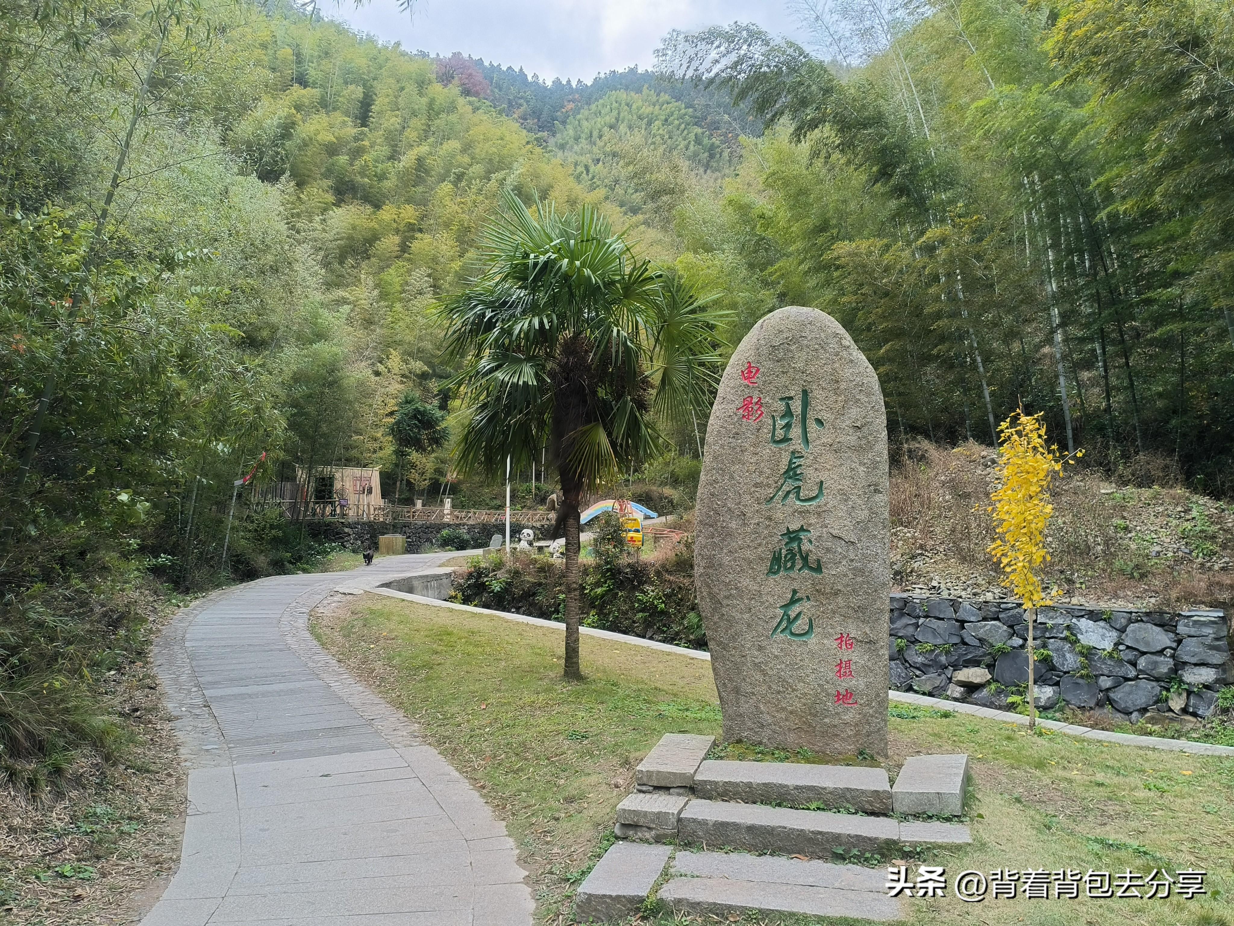 隨後便獨自下山,真是上山容易下山難,一路土路下坡,不注意的情況下,非常容易摔倒,我便小心翼翼的走到景區道路,不遠處就是臥虎藏龍的拍攝地,旁邊就是木坑村,走到木坑村,才知道這片竹林都是臥虎藏龍取景之地,在木坑村停留片刻,找到最佳的角度拍攝,看到被竹林環繞的木坑村,站在此處感覺非常有意境,村內也有圍爐煮茶-酒吧-民宿等,之後,穿過木坑村到好漢坡,這裏有臥虎藏龍拍攝地的石碑,在此處打卡拍照後,便返回至秀女湖