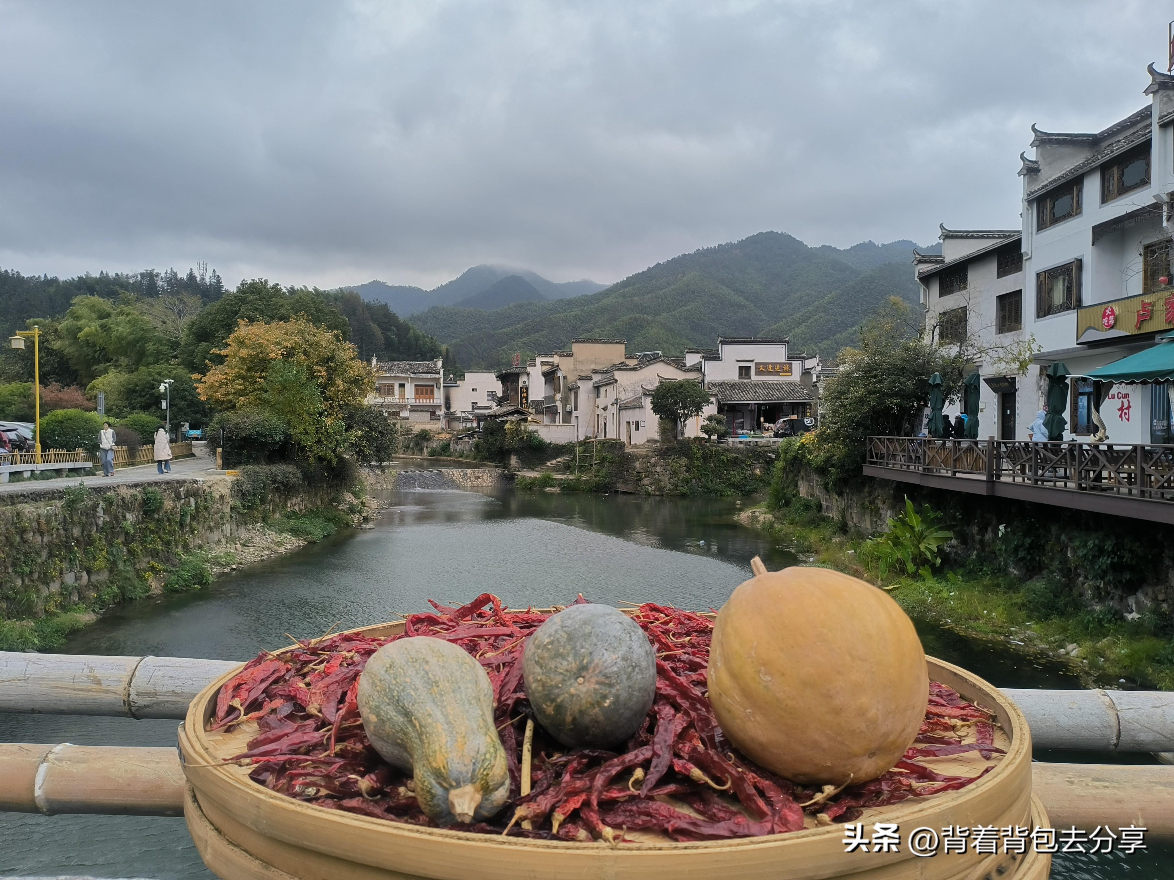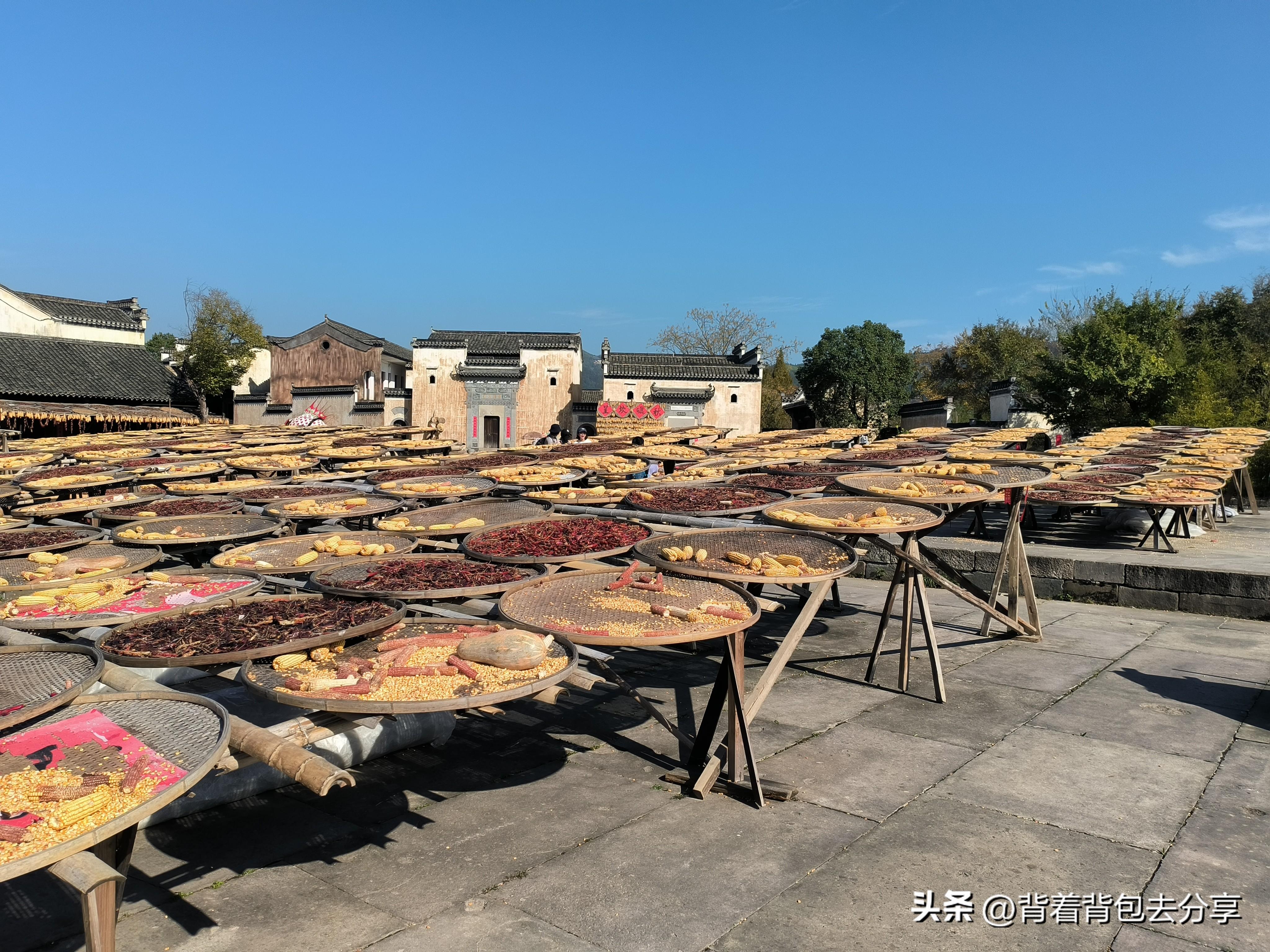 當我走到檢票口處,看到門口二維碼,掃碼之後會出現呈坎免費的入園信息,緊接着由工作人員查看,直接走免費通道,進入呈坎古村後,看到的景象和四年前有所差異,後來得知,現在的呈坎分爲兩個區域古村落與永興湖,這裏屬於古村落,我們看到的八卦門就在這裏,途中有一處廣場,廣場之上曬滿了豐收的農作物,玉米辣椒葫蘆等,很多遊客藉助曬晾的產物,以及後面的山峯,在此拍照取景,確實非常好看,緊接着來到八卦門,果不其然,這裏的遊客很多,都在找取機位,進行拍照