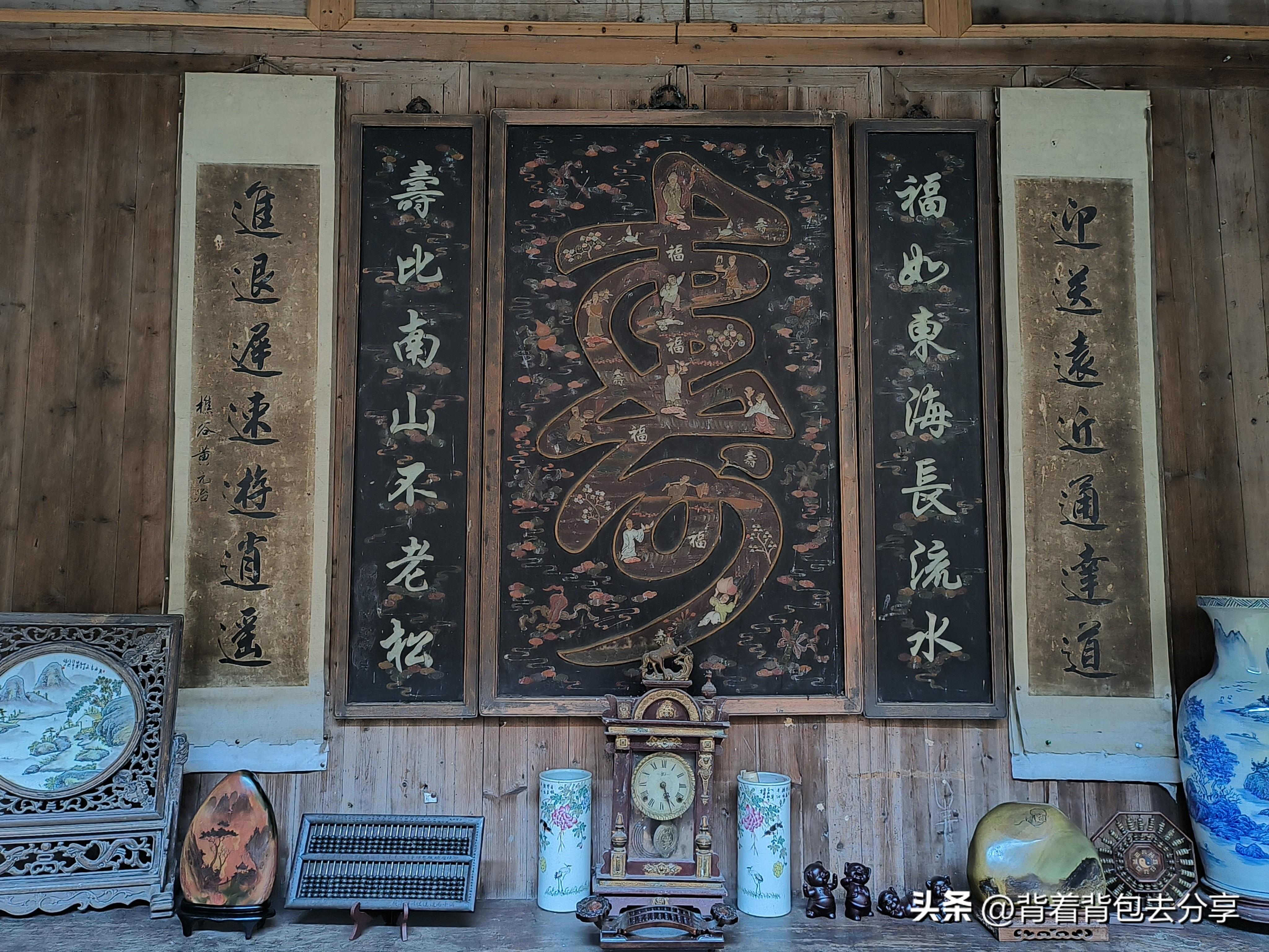 看過大夫第之後,聽到不遠處的水流聲,河水穿村而過,正對面便是胡氏宗祠,又稱敬愛堂,在此找取裏面的孝字,未找到,後來與工作人員搭訕,讓我回頭查看,在門中之上,便是朱熹所書的孝字,當時與兒子講起,要細看此字,集字畫一體,字中有畫,畫中有字,上部像一個仰面拱手作揖跪地,敬孝長輩的俊俏後生,而後面則是一個猴子的嘴臉,能敬孝長輩則爲孝,反祖則爲畜牲,其教育意義極爲深刻,來敬愛堂一定要細細觀察