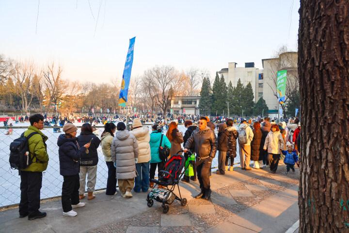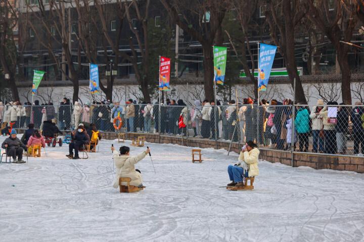12月28日,北京團結湖公園冰場人氣滿滿,冰場外的遊客排着長隊等待入場。記者 曹雪文 攝