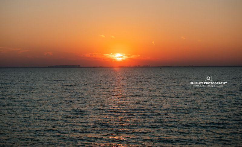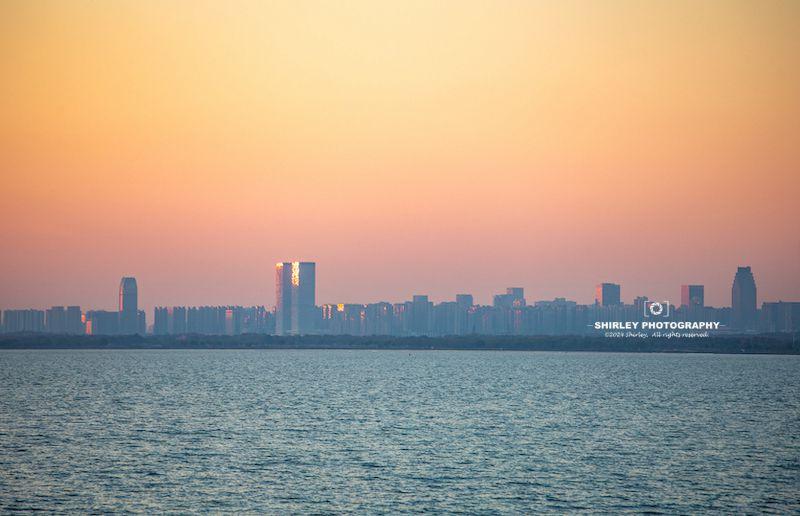 湖對岸就是濱湖區的摩天大樓,落日時分,建築的玻璃幕牆被夕陽光折射得璀璨奪目,感嘆合肥真的把CBD一步一步地擴展到了巢湖邊上。
