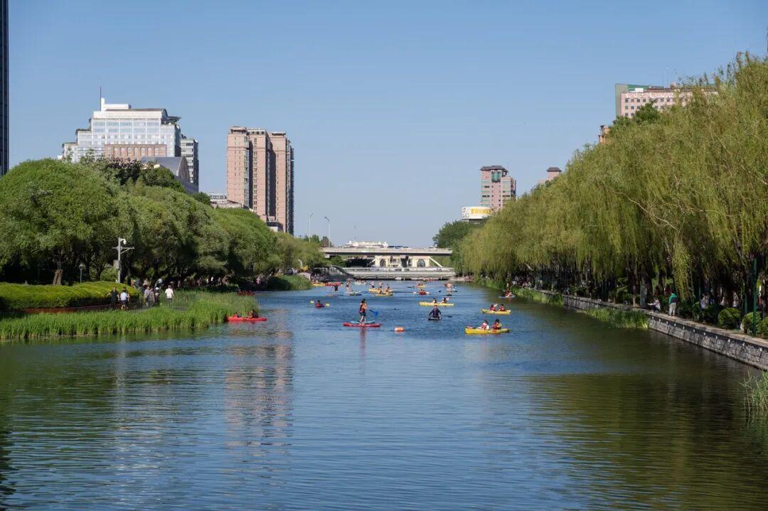 秋天的亮馬河波光粼粼,岸邊點綴着各色花朵,淺水區的菖蒲、蘆葦搖曳,湖面點綴着大片的荷葉。除了自然風光,這片水域融合了旖旎的都市風光和絕佳的地理位置,也是皮划艇、揹包船、槳板等水上運動愛好者心中的好去處。亮馬河畔的一家水上營地負責人姚麗說:“以前體驗水上運動要去郊區,現在不那麼專業的也可以在亮馬河體驗了。”