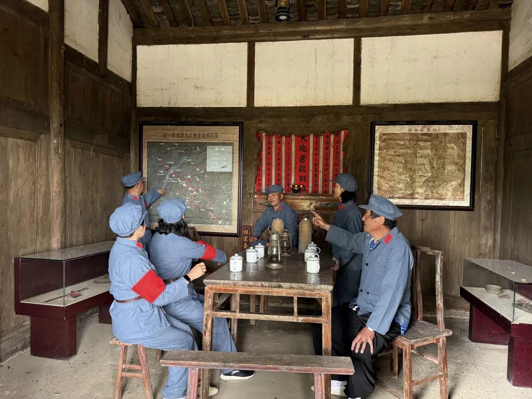 強渡烏江指揮部舊址牆上的作戰圖清晰可辨,我們隊員饒有興趣DIY模仿紅軍在研究作戰地圖拍照留念。緊接着來到了突破烏江紀念廣場,迴龍渡碼頭依舊繁忙,彷彿還能聽見當年衝鋒號聲在河面上迴盪。