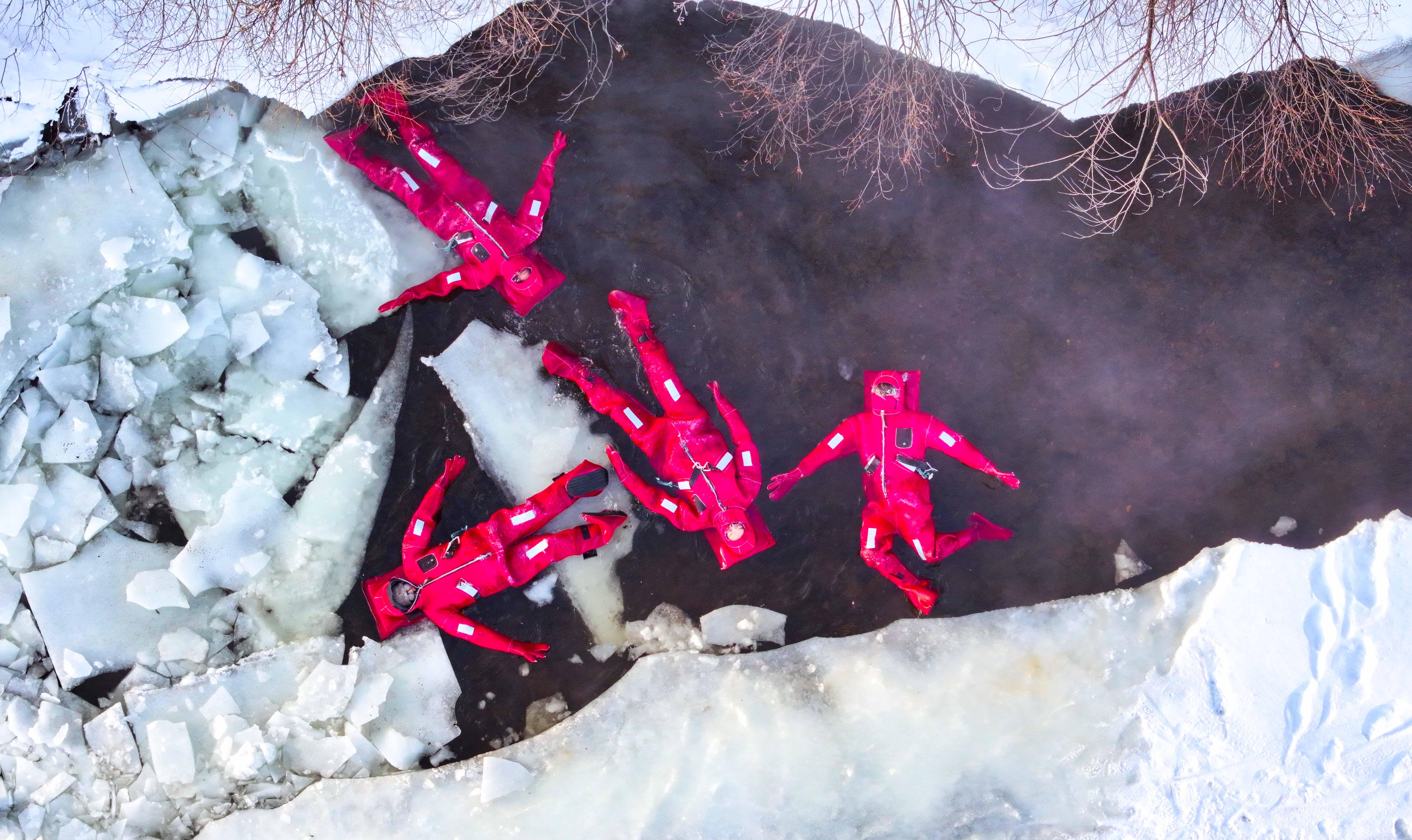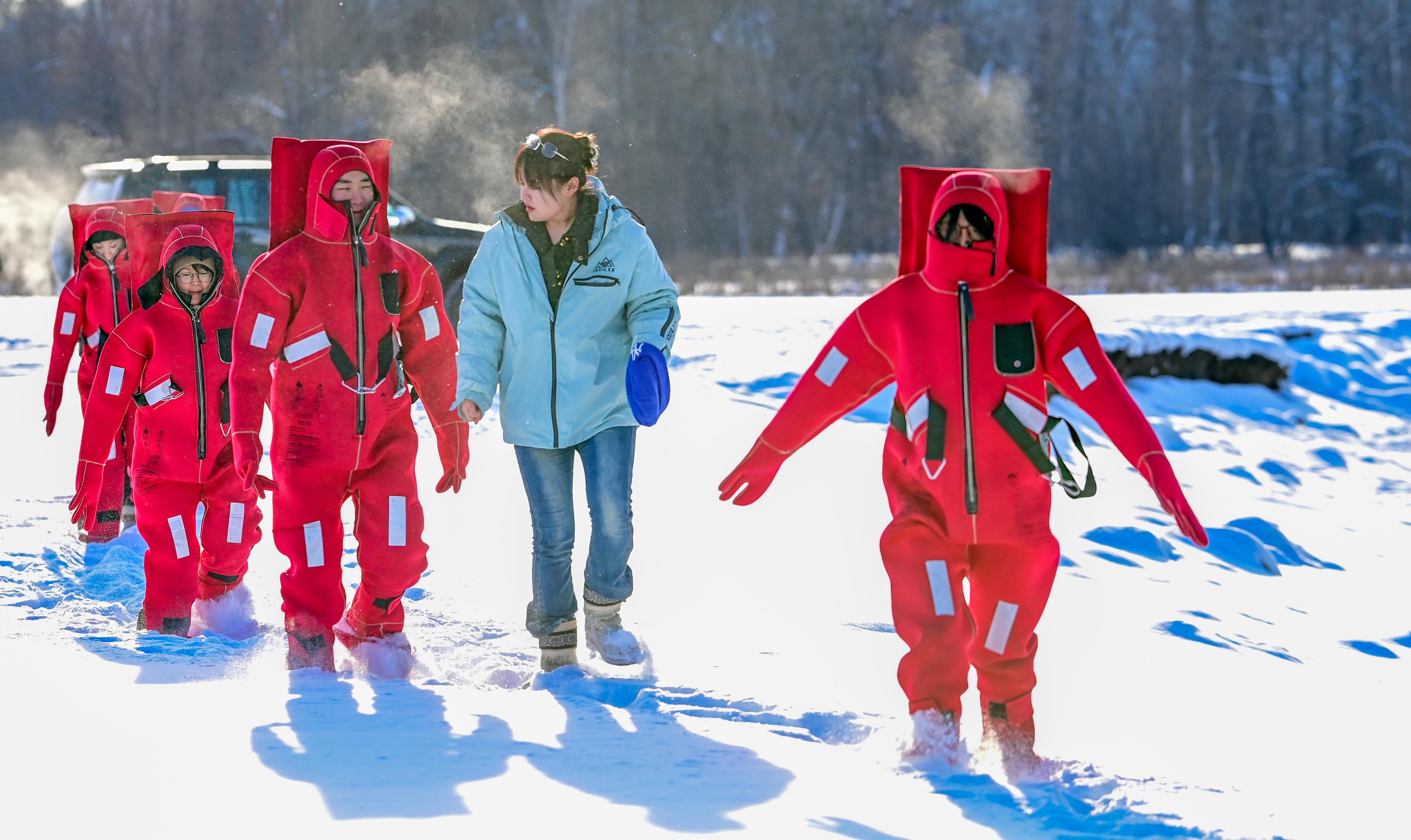 這一新奇項目吸引了大量遊客,他們身着專業防寒裝備,漂浮於零下40攝氏度的冰河之上,置身於巍峨雪山與晶瑩霧凇之間,盡情感受極寒環境下的壯美風光。