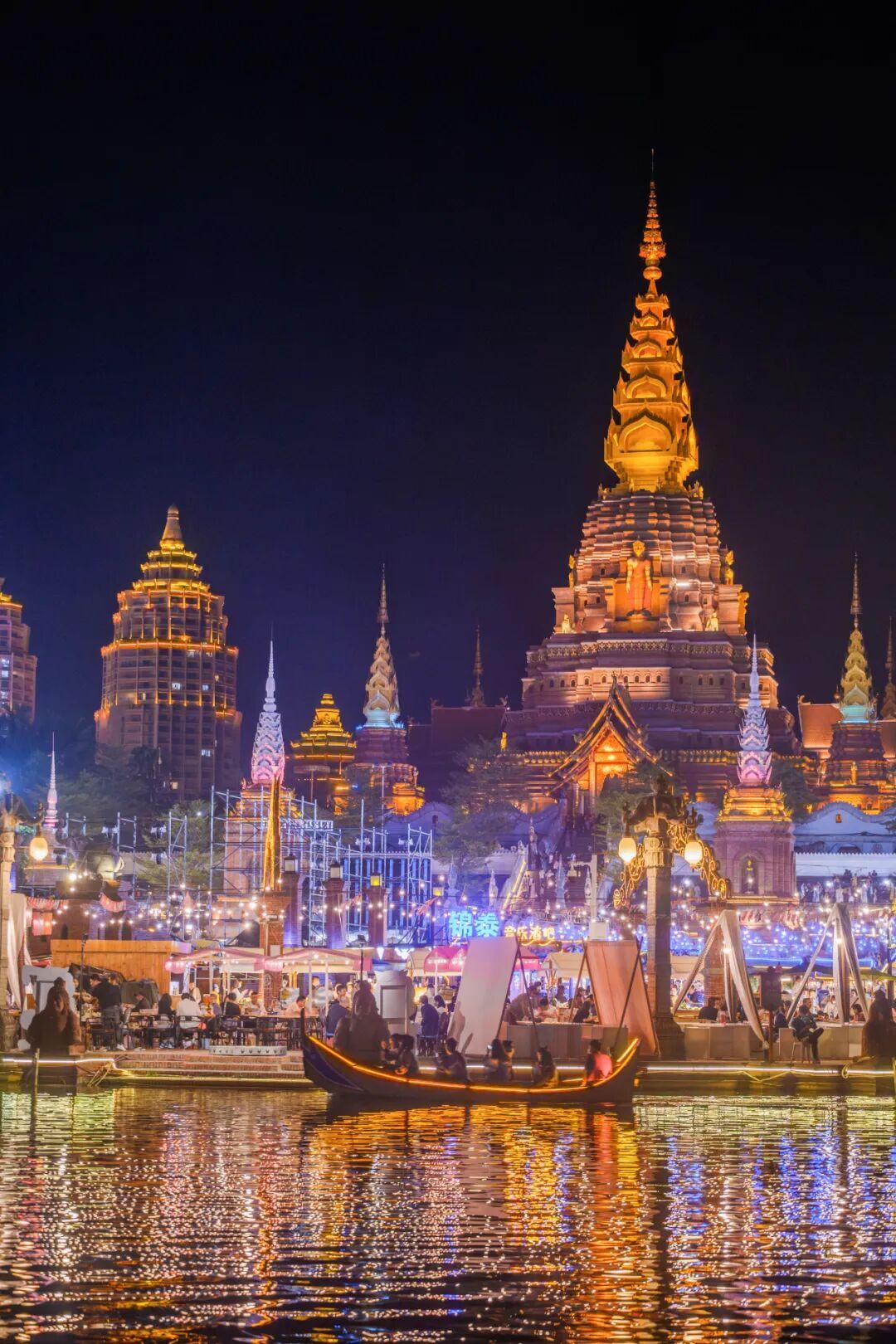△瀾滄江邊的告莊西雙景,傍晚時分的大金塔和燈光夜…