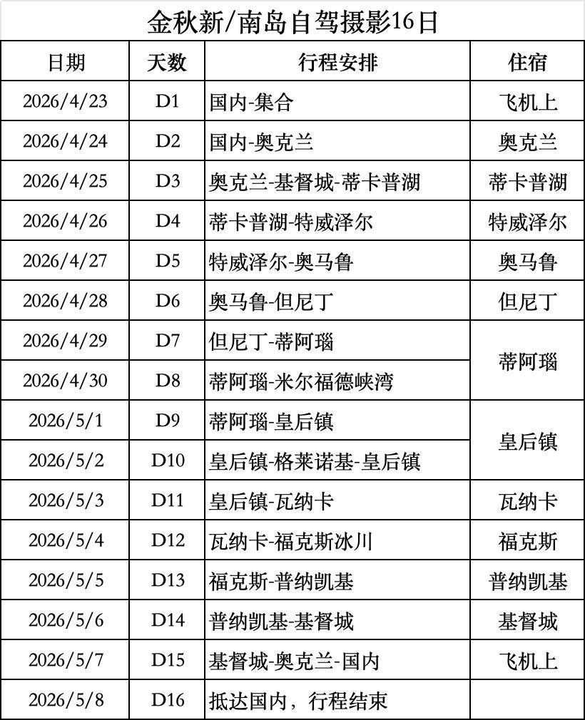 注:以上行程會根據天氣和一些現實狀況,做出有利於大家最佳觀景及遊玩感受的順序調整,不會減少遊玩攝影時間和刪減目的地(閉館,關閉或突發情況除外)
