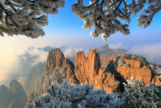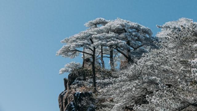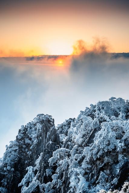 我總愛在山上待上一整天,從清晨到日暮,看霧凇在光影裏的萬千變化。清晨的霧凇,帶着夜的寒涼,冰晶上凝着細小的露珠,沉甸甸的,壓得松枝微微低垂。晌午的陽光暖起來,冰晶開始消融,順着松針滴落,在石板上敲出清脆的聲響,空氣裏瀰漫着溼潤的水汽,霧凇的顏色也變得愈發清亮。到了傍晚,夕陽西下,餘暉灑在霧凇上,給那些銀白的枝丫鍍上一層金紅,遠山如黛,近松似霞,整個黃山像是被裝進了一幅流光溢彩的畫卷裏。