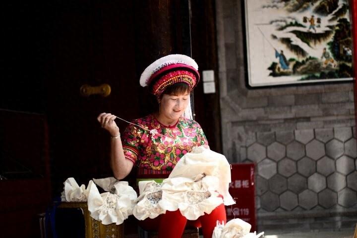 距離大理古城約20公里的喜洲鎮周城村,汩汩的泉水順着七拐八彎的巷道流淌,兩側白牆青瓦院落是白族的傳統建築。一陣風吹來,院子裏晾曬的扎染布如蝴蝶翻飛,扎染的主要染料——板藍根發酵出的獨特清香縈繞不去。白族扎染技藝的國家級代表性傳承人段銀開指間纏繞着針線,素白棉布在針腳間蜷成細密的結。