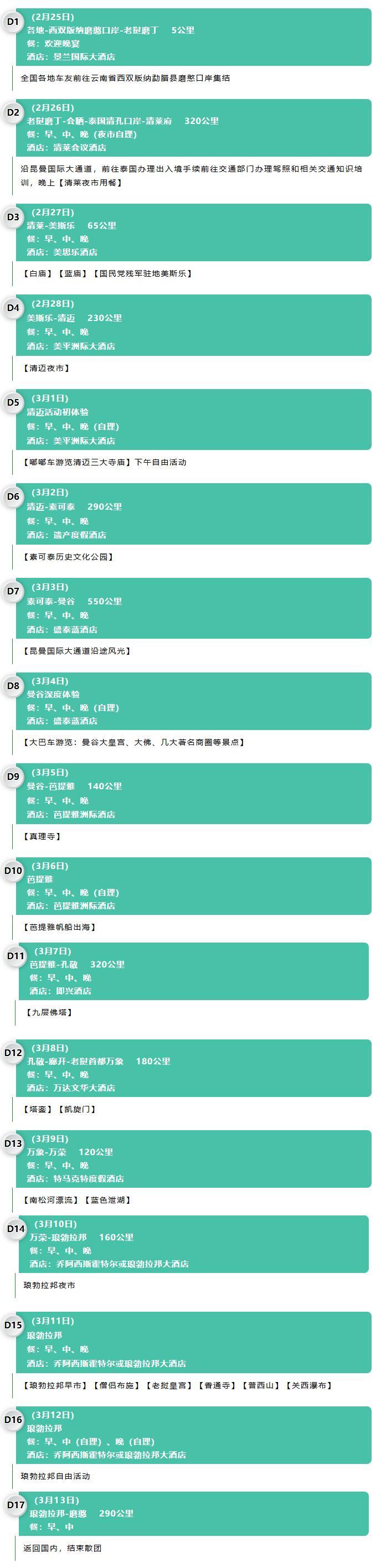 路線一覽:雲南西雙版納(磨憨口岸)→ 老撾磨丁→會曬→泰國清孔口岸→清萊→美斯樂→清邁→素可泰→曼谷→芭提雅→孔敬→廊開→老撾萬象→萬榮→琅勃拉邦→雲南(磨憨口岸)