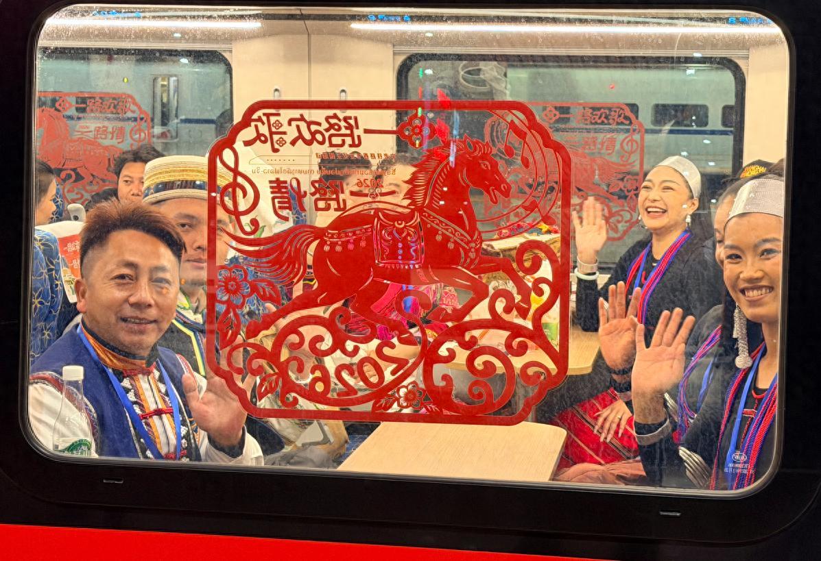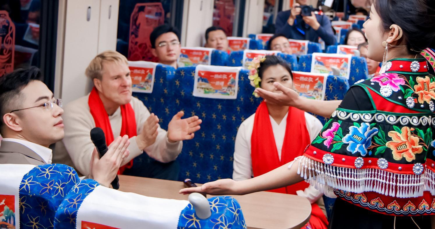 在4個多小時的行程中,列車車廂化身爲流動的“文化客廳”,來自中老兩國的藝術團體與各界代表在此共迎新春、共敘友誼。活動安排了文藝展演、民俗體驗、故事分享等環節,《放馬山歌》《花鼓·花鼓》《Fun傣》等節目極具雲南特色,新派花燈劇《鐵路情·文明行》、雲南方言說唱《雲南DNA》、嗩吶獨奏《百鳥朝鳳》讓人眼前一亮。老撾藝術家帶來《一路生花》《中老友誼》等融合兩國文化元素的節目,車廂內掌聲不斷、歡聲笑語。
