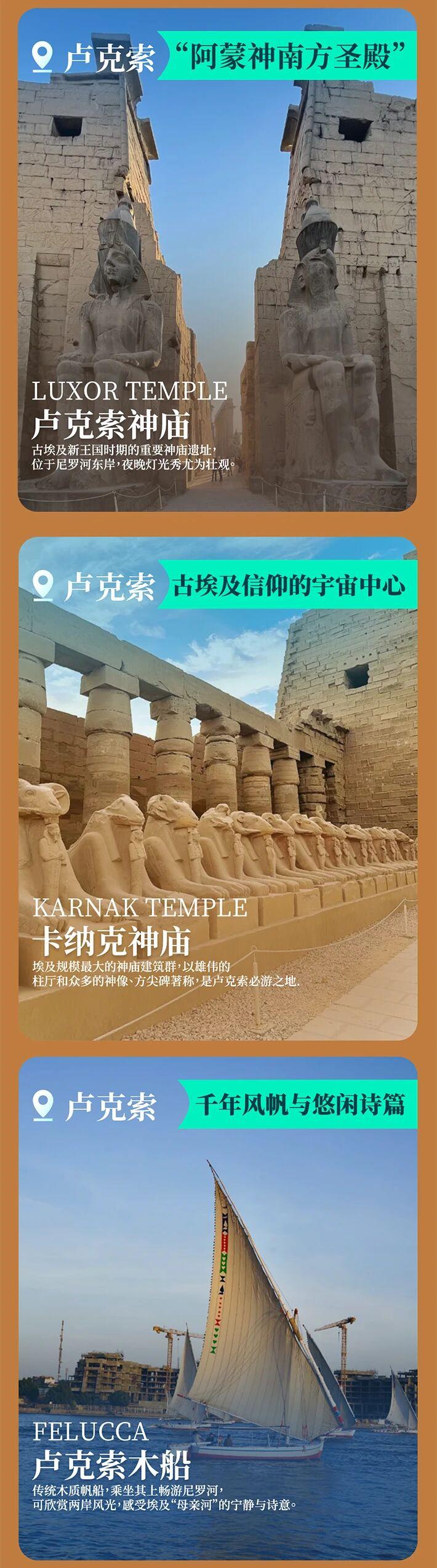 - 盧克索:盧克索神廟、卡納克神廟、帝王谷、女王神廟。
