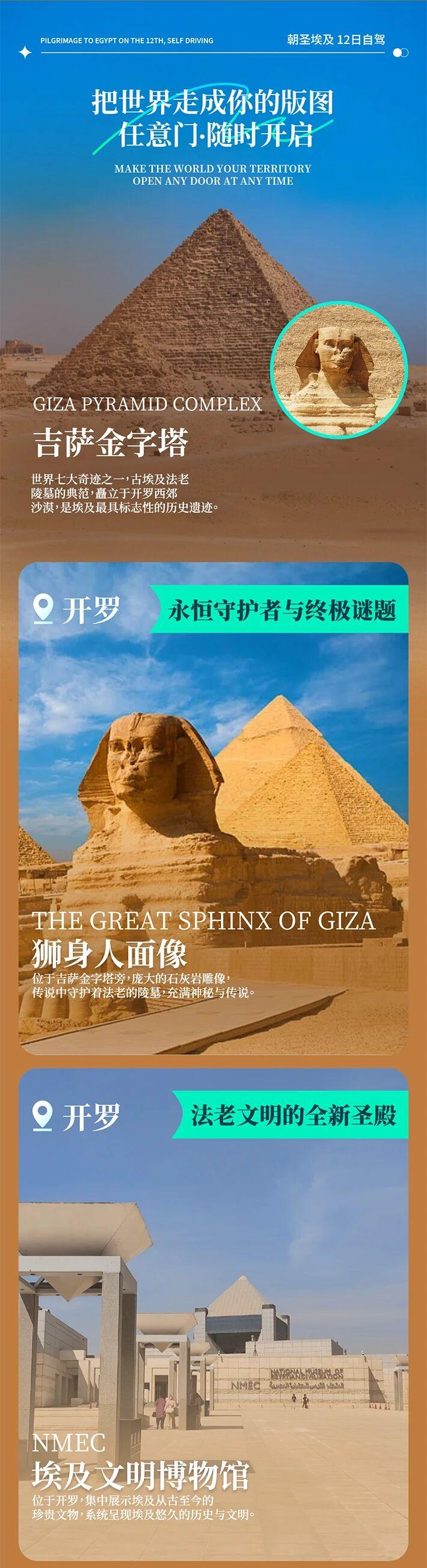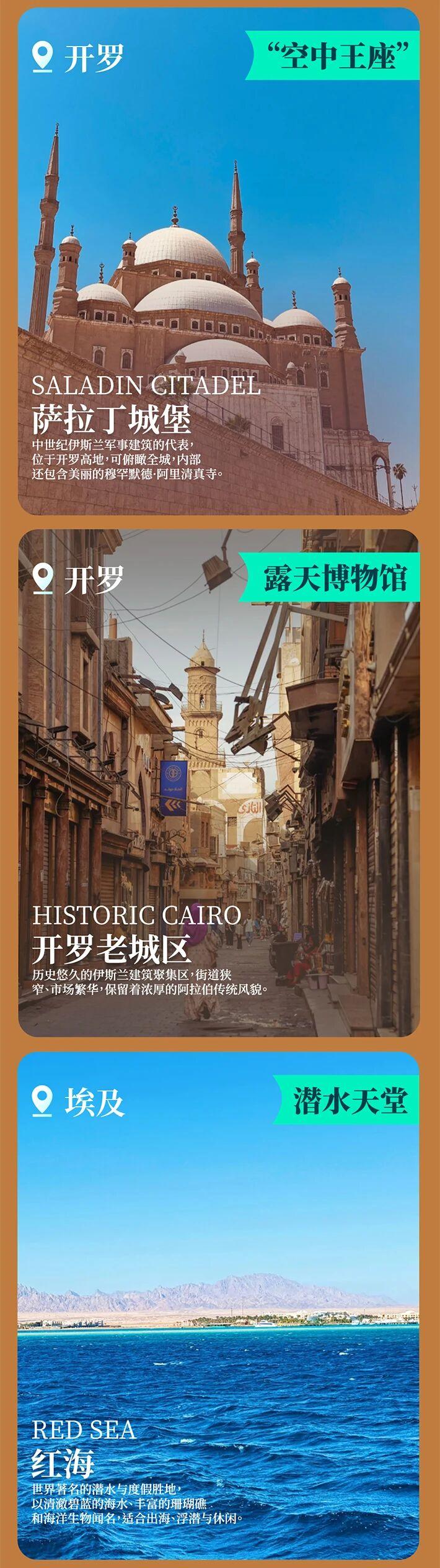 - 開羅:吉薩金字塔、獅身人面像、薩拉丁古城堡、埃及文明博物館、哈利利集市。