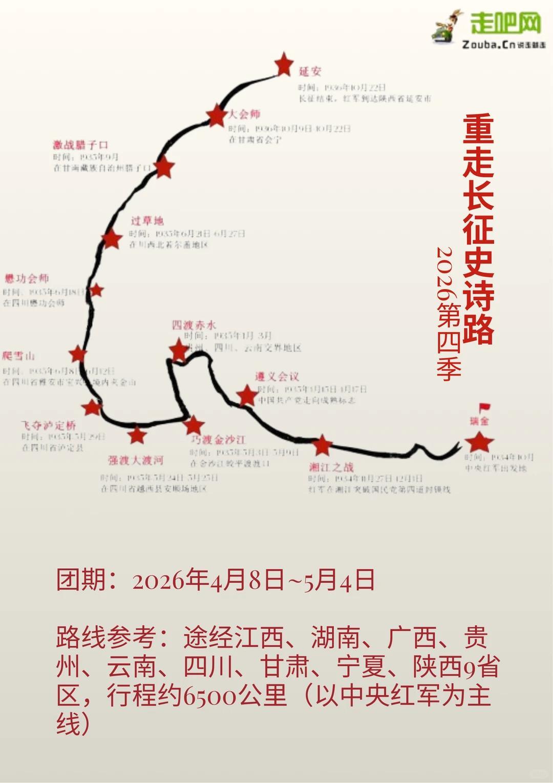 路線參考:途經江西、湖南、廣西、貴州、雲南、四川、甘肅、寧夏、陝西9省區,行程約6800公里(以中央紅軍爲主線)