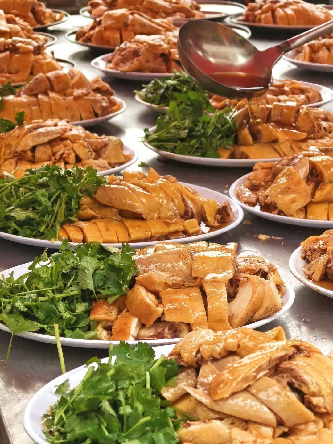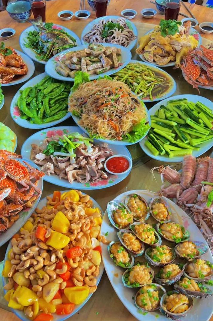 桌上擺滿白切雞、蒜蓉扇貝蒸粉絲、三絲炒米粉、白灼蝦、海鮮粥、清蒸魚、紅燜扣肉、紅燒乳鴿、菠蘿咕嚕肉、炸雞翅、炒花蟹……琳琅滿目,眼花繚亂。