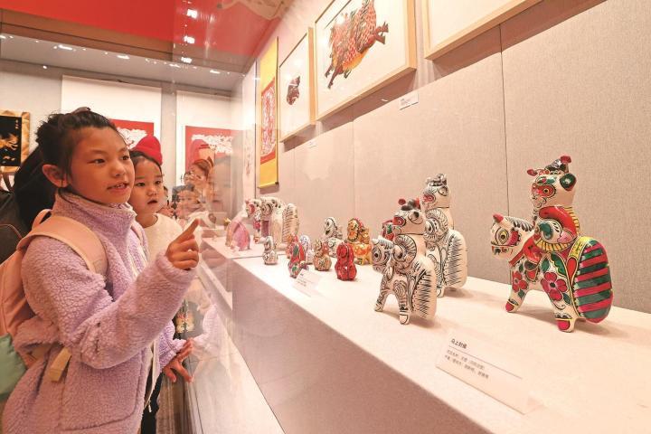 小朋友被展出的各種馬主題非遺作品吸引