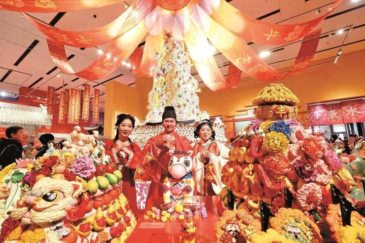 “民以食爲天”,春節最具儀式感的環節永遠是那一桌熱氣騰騰的團圓飯。“食爲天”單元將中國人的糧食觀與年俗文化巧妙融合。展廳中央,一座高4.5米、直徑3.6米的澄城面花“大鼓棗山”格外醒目。環繞“大鼓棗山”,南北各地的非遺美食齊聚一堂,非遺傳承人的現場演示更是讓年味觸手可及。揉麪、包餡、雕花……指尖的技藝流轉間,是家的味道,是團圓的滋味,是煙火人間裏最溫暖的文化表達。
