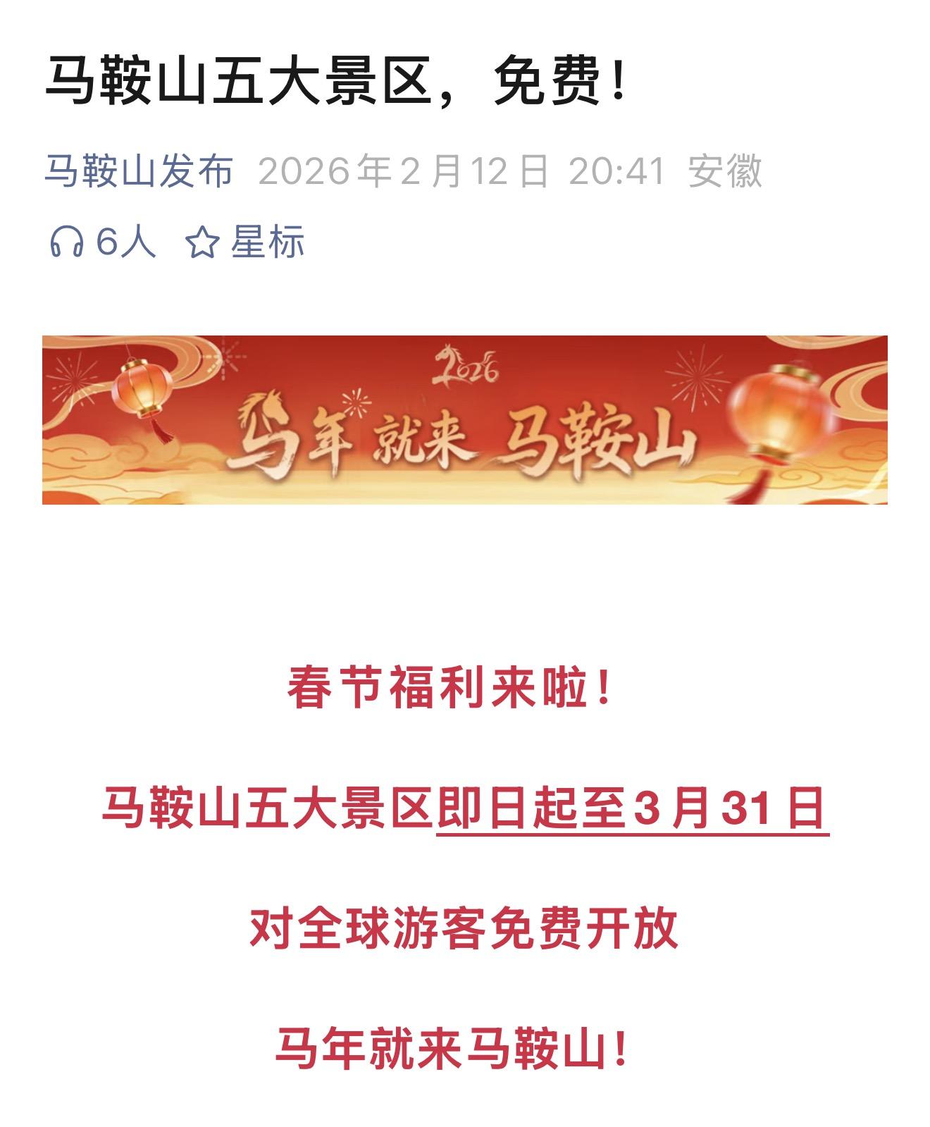 ③安徽馬鞍山採石磯景區、褒禪山景區、太湖山景區、霸王祠景區、李白文化園向全球遊客免費開放至3月31日;