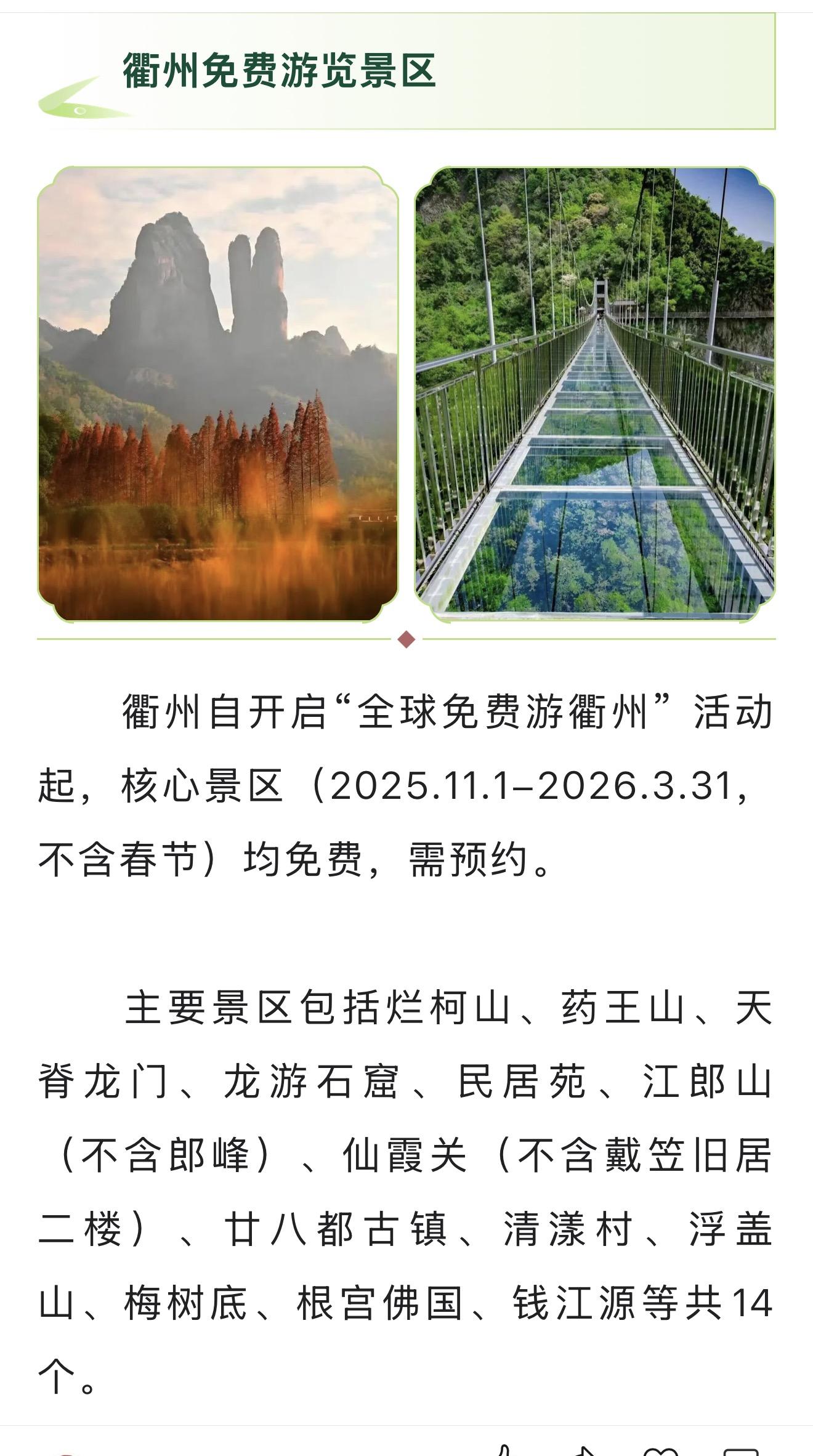 ②浙江衢州爛柯山、藥王山、天脊龍門等14個核心景區向遊客免門票開放至3月31日;