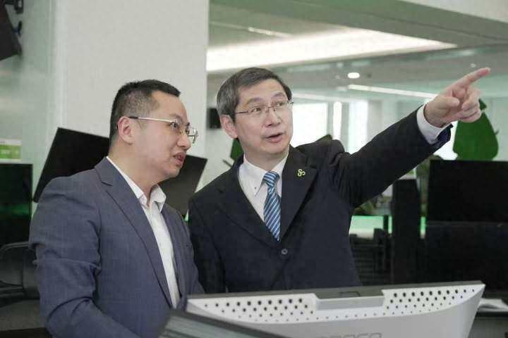 在春秋航空運行指揮中心,王煜(右)瞭解當天航班運行情況。 受訪者 供圖