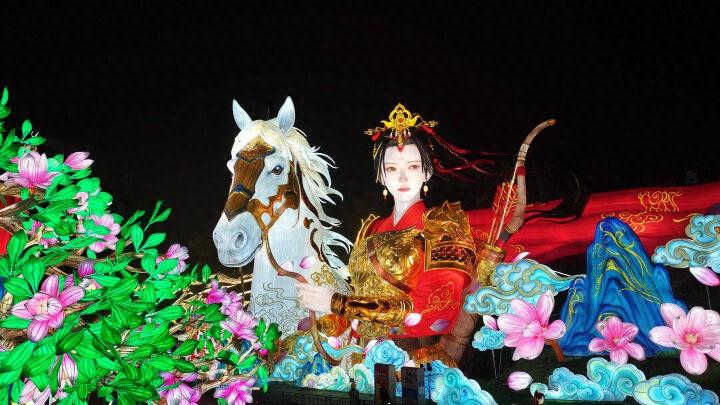 記者近日在中華彩燈大世界看到,園區內11組大型燈組與200餘組中小型燈組交相輝映,十大主題板塊鋪展開一幅流光溢彩的東方畫卷,讓本屆燈會更顯璀璨。在“頂流”燈組《木蘭傳奇》前,相機、手機等拍照聲此起彼伏。高18米、長180米的巨型燈組,將花木蘭英姿與駿馬奔騰融爲一體。來自深圳的遊客李雨玲站在燈下連連讚歎:“太壯觀了!連睫毛都根根分明。每隔幾秒,木蘭就會在燈火中眨眼‘醒來’。”燈影流轉間,傳統英雄彷彿從史書中走出,成爲年輕人爭相打卡的巨型“國潮手辦”。