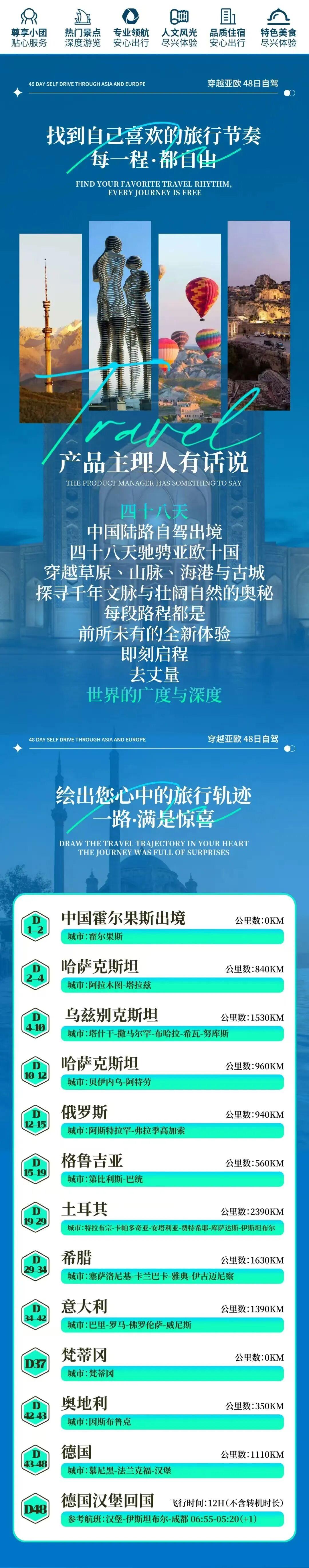 6月30日霍爾果斯集結 → 中亞(哈薩克斯坦·烏茲別克斯坦)→ 俄羅斯南線 → 高加索雙國(格魯吉亞)→ 橫跨土耳其 → 希臘愛琴海跳島 → 意大利文藝復興深度 → 梵蒂岡 → 奧地利阿爾卑斯 → 德國童話之路 → 8月16日漢堡散團