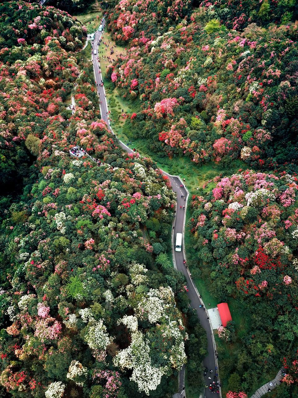 畢節,坐擁世界上最大的天然野生杜鵑林帶,春天漫山遍野的杜鵑次第開放,紅、粉、白、紫各色花朵鋪展百里,堪稱“地球綵帶”。