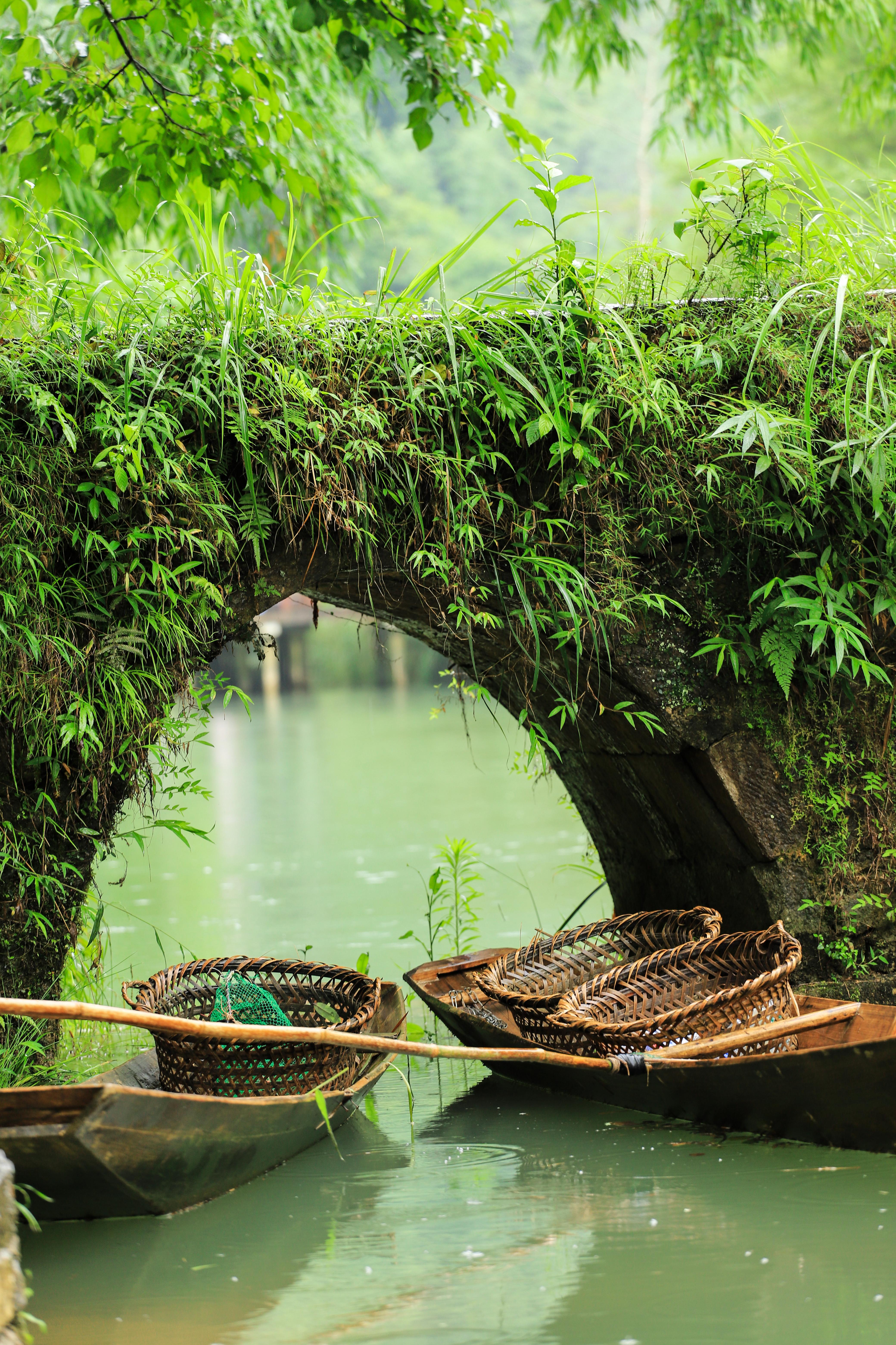 小七孔古橋橫跨碧綠潭水,瀑布飛流直下,水上森林光影斑駁,潭水藍綠交織,清澈見底,徒步林間,每一口呼吸都是負氧離子。