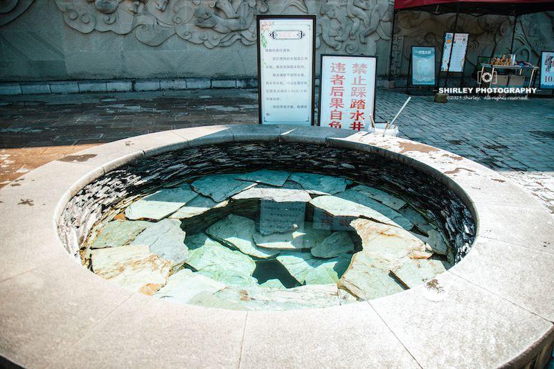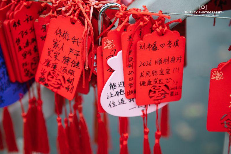 遊客可以自帶容器從井裏接水,沒帶的話也可以從旁邊的攤位購買。慕名而來的遊客不少,雙胞井對面的橋上掛滿了遊客留下的祈福牌,內容不用猜也知道與雙胞胎有關。