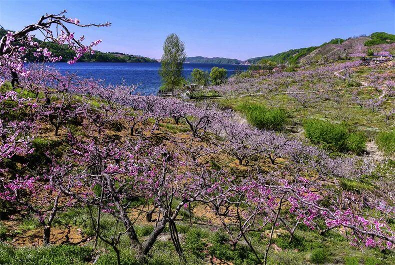 鴨綠江畔的桃花、梨花次第開放,